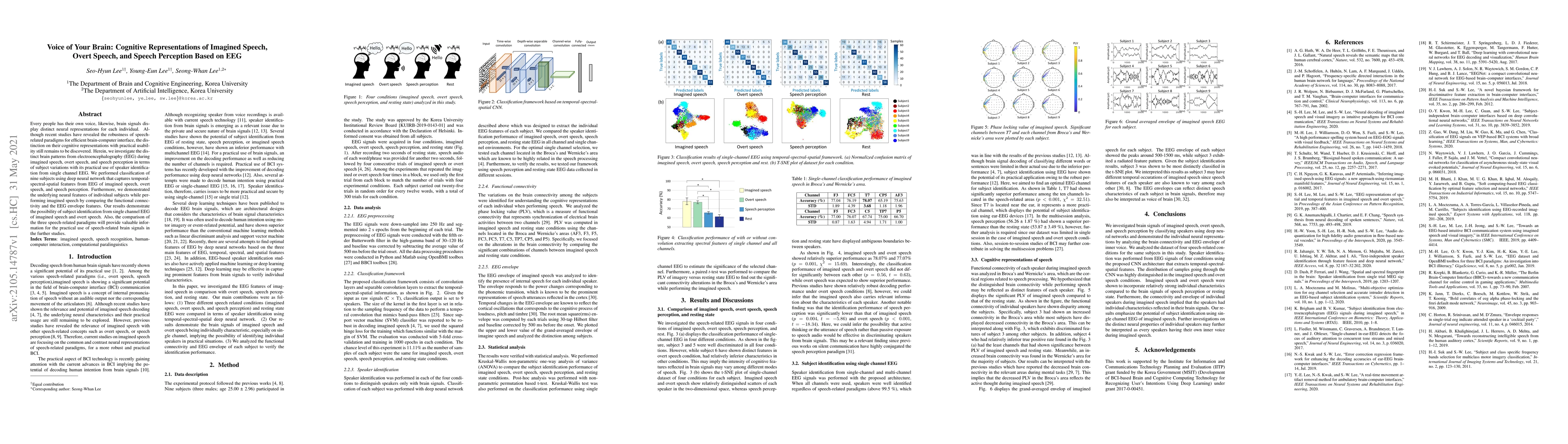 This study uses EEG to distinguish brain patterns for imagined speech, overt speech, and speech perception, aiming to identify individual subjects based on single-channel EEG. Results show the potential for speaker identification from these paradigms and provide insights for future brain-computer interface applications.
