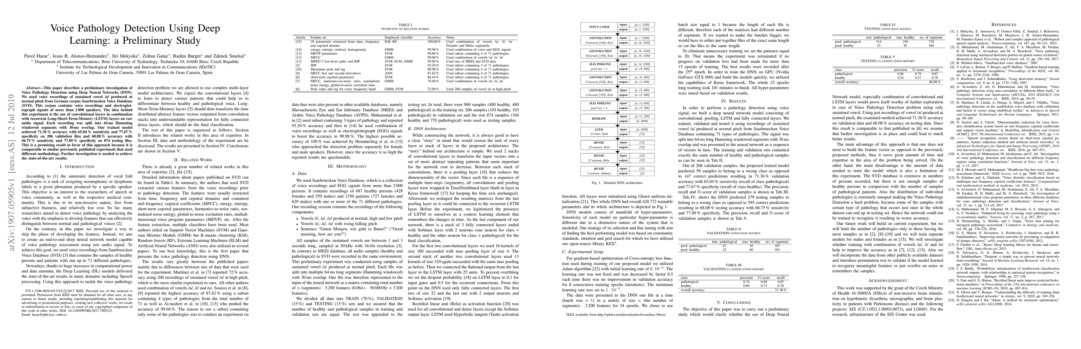 This study explores voice pathology detection using Deep Neural Networks, specifically combining convolutional and LSTM layers on raw audio signals. The preliminary results show promising accuracy, sensitivity, and specificity, indicating potential for this approach, though further research is required to reach state-of-the-art performance.