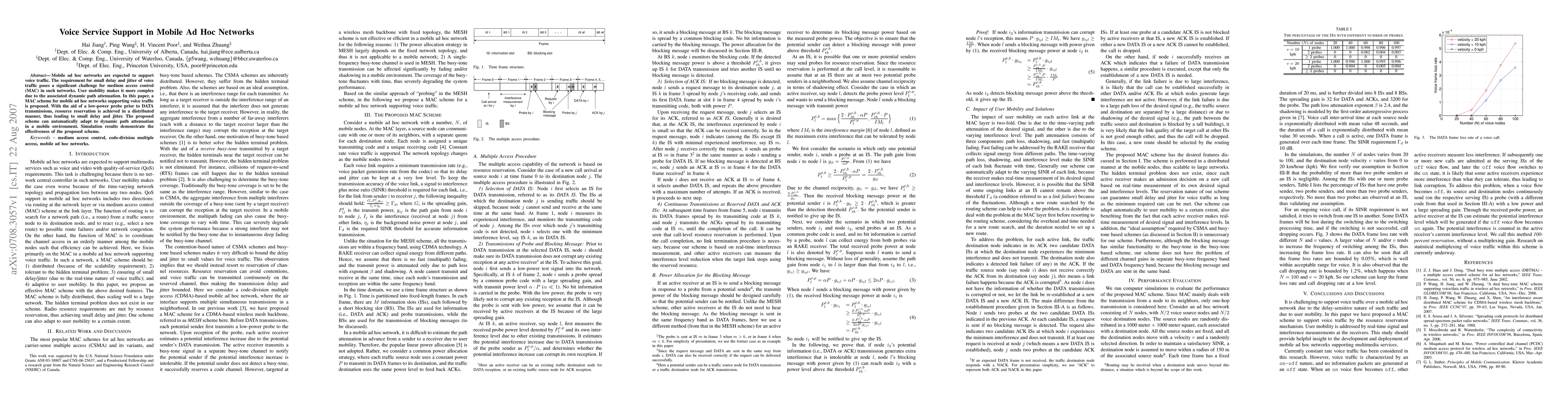 This paper proposes a MAC scheme for mobile ad hoc networks to support voice traffic, utilizing low-power probes for distributed resource reservation to minimize delay and jitter. The scheme adapts to dynamic path attenuation due to user mobility, as demonstrated by effective simulation results.