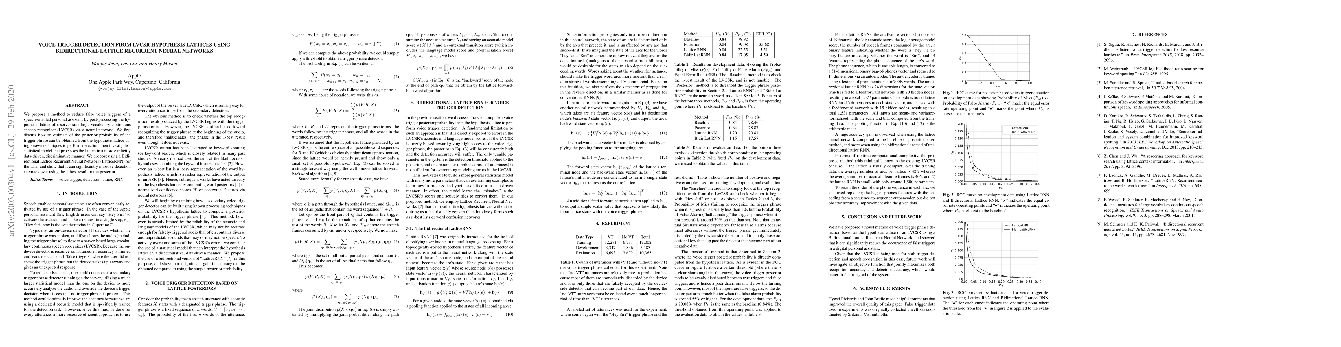 We propose a method to reduce false voice triggers of a speech-enabled personal assistant by post-processing the hypothesis lattice of a server-side large-vocabulary continuous speech recognizer (LVCSR) via a neural network. We first discuss how an estimate of the posterior probability of the trigger phrase can be obtained from the hypothesis lattice using known techniques to perform detection, then investigate a statistical model that processes the lattice in a more explicitly data-driven, discriminative manner. We propose using a Bidirectional Lattice Recurrent Neural Network (LatticeRNN) for the task, and show that it can significantly improve detection accuracy over using the 1-best result or the posterior.