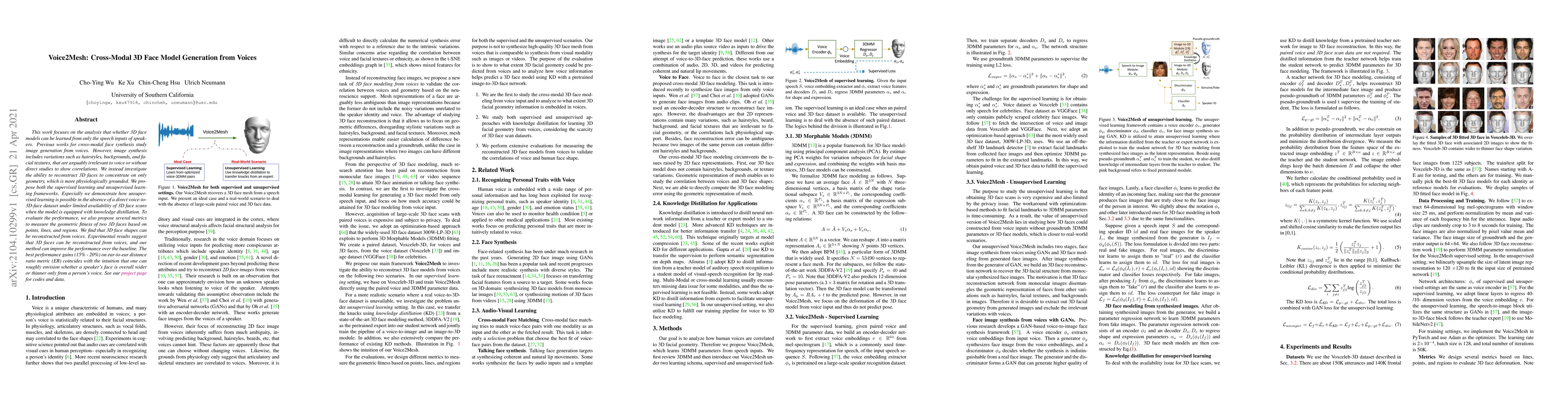 Voice2Mesh proposes a method to generate 3D face models from voice inputs, focusing on geometry rather than irrelevant visual features. The study demonstrates both supervised and unsupervised learning frameworks, achieving notable improvements (15%-20%) in reconstructing face shapes from voices, particularly in the ear-to-ear distance ratio.