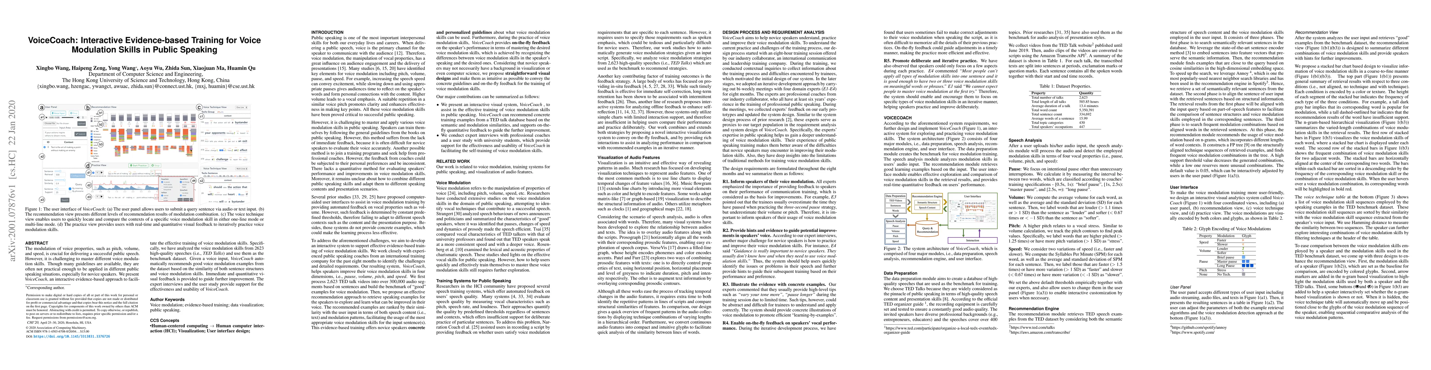 VoiceCoach is an interactive tool that uses evidence from high-quality TED Talks to provide real-time recommendations and feedback for improving voice modulation skills in public speaking. The system offers practical, data-driven training that helps novice speakers refine their pitch, volume, and speed.