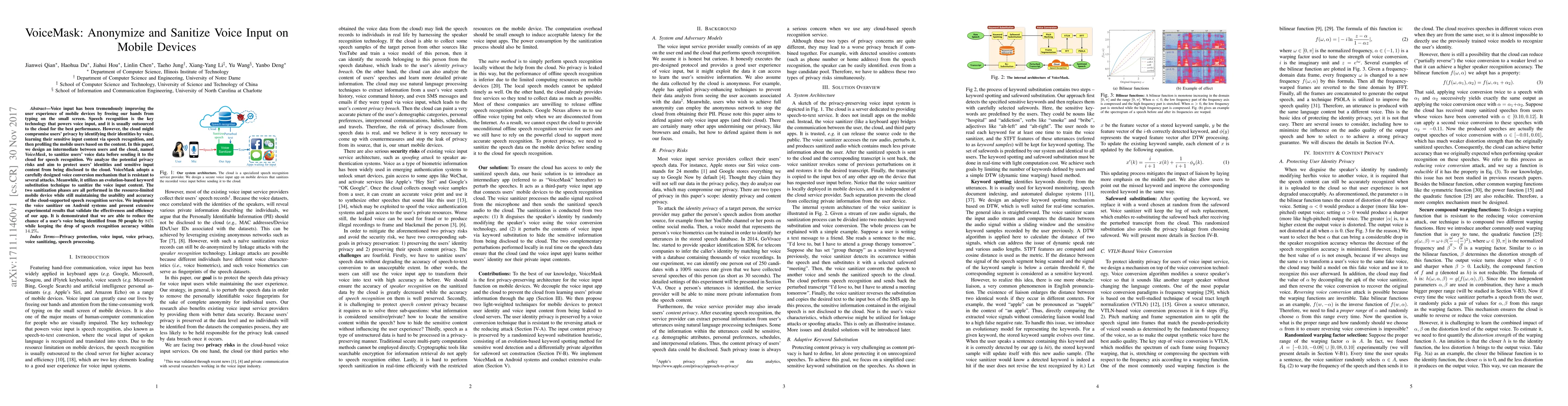 VoiceMask is a mobile app designed to anonymize and sanitize voice input data before sending it to the cloud for speech recognition, significantly reducing the risk of privacy breaches while maintaining speech recognition accuracy. The app employs a voice conversion mechanism and an evolution-based keyword substitution technique to protect users' identities and sensitive content.