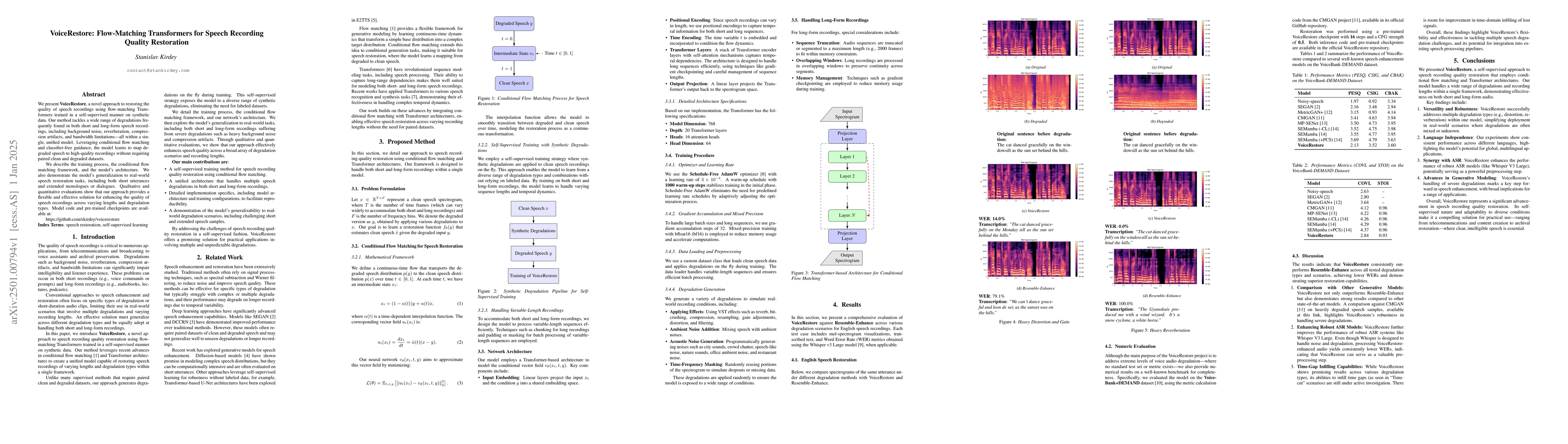 VoiceRestore employs flow-matching Transformers trained in self-supervised fashion on synthetic data to restore speech recording quality by addressing noise, reverberation, compression artifacts, and bandwidth issues. The method generalizes to real-world tasks, offering a flexible solution for enhancing speech recordings of varying lengths and types of degradation.