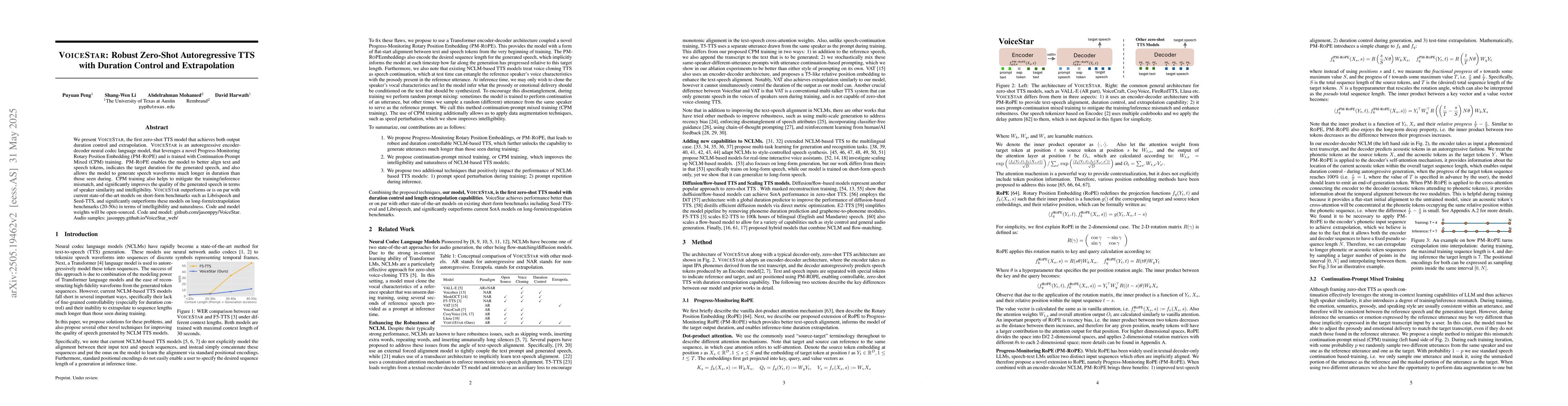 VoiceStar is an autoregressive encoder-decoder neural codec language model that uses a Progress-Monitoring Rotary Position Embedding (PM-RoPE) and is trained with Continuation-Prompt Mixed (CPM) training to achieve zero-shot duration control and extrapolation in text-to-speech synthesis.