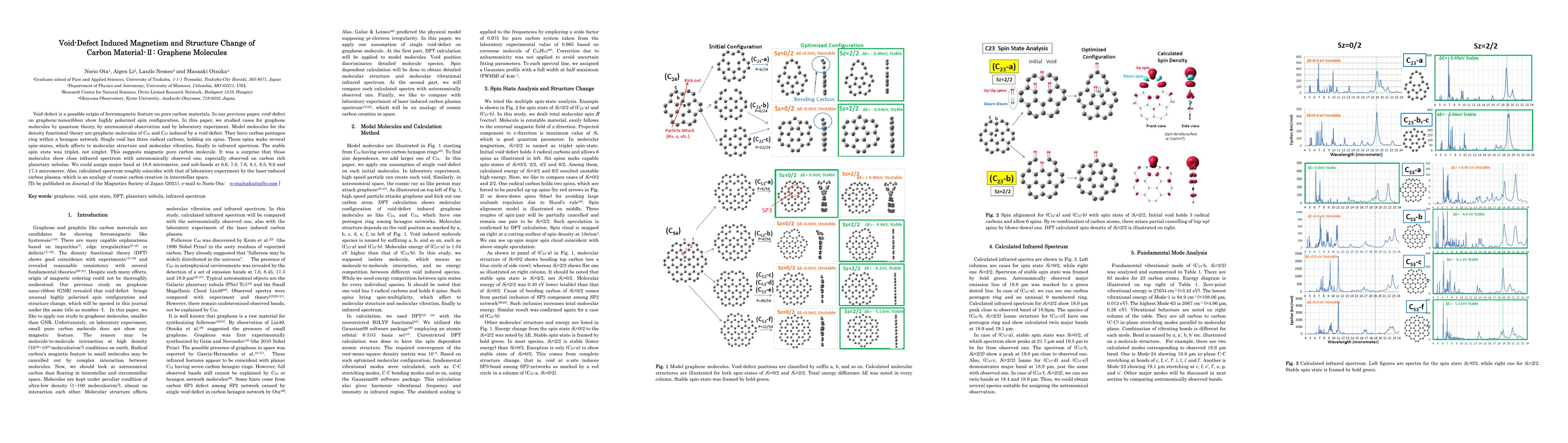 Void-defect is a possible origin of ferromagnetic feature on pure carbon materials. In our previous paper, void-defect on graphene-nanoribbon show highly polarized spin configuration. In this paper, we studied cases for graphene molecules by quantum theory, by astronomical observation and by laboratory experiment. Model molecules for the density functional theory are graphene molecules of C23 and C53 induced by a void-defect. They have carbon pentagon ring within a hexagon network. Single void has three radical carbons, holding six spins. Those spins make several spin-states, which affects to molecular structure and molecular vibration, finally to infrared spectrum. The stable spin state was triplet, not singlet. This suggests magnetic pure carbon molecule. It was a surprise that those molecules show close infrared spectrum with astronomically observed one, especially observed on carbon rich planetary nebulae. We could assign major band at 18.9 micrometer, and sub-bands at 6.6, 7.0, 7.6, 8.1, 8.5, 9.0 and 17.4 micrometer. Also, calculated spectrum roughly coincides with that of laboratory experiment by the laser-induced carbon plasma, which is an analogy of cosmic carbon creation in interstellar space.
