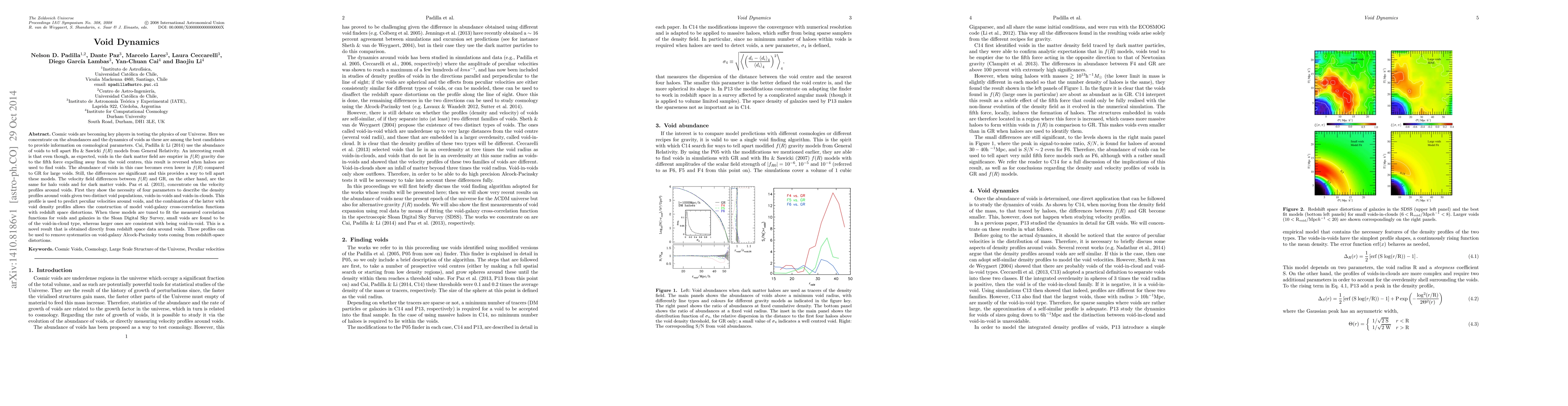Cosmic voids are becoming key players in testing the physics of our Universe. Here we concentrate on the abundances and the dynamics of voids as these are among the best candidates to provide information on cosmological parameters. Cai, Padilla \& Li (2014) use the abundance of voids to tell apart Hu \& Sawicki $f(R)$ models from General Relativity. An interesting result is that even though, as expected, voids in the dark matter field are emptier in $f(R)$ gravity due to the fifth force expelling away from the void centres, this result is reversed when haloes are used to find voids. The abundance of voids in this case becomes even lower in $f(R)$ compared to GR for large voids. Still, the differences are significant and this provides a way to tell apart these models. The velocity field differences between $f(R)$ and GR, on the other hand, are the same for halo voids and for dark matter voids. Paz et al. (2013), concentrate on the velocity profiles around voids. First they show the necessity of four parameters to describe the density profiles around voids given two distinct void populations, voids-in-voids and voids-in-clouds. This profile is used to predict peculiar velocities around voids, and the combination of the latter with void density profiles allows the construction of model void-galaxy cross-correlation functions with redshift space distortions. When these models are tuned to fit the measured correlation functions for voids and galaxies in the Sloan Digital Sky Survey, small voids are found to be of the void-in-cloud type, whereas larger ones are consistent with being void-in-void. This is a novel result that is obtained directly from redshift space data around voids. These profiles can be used to remove systematics on void-galaxy Alcock-Pacinsky tests coming from redshift-space distortions.