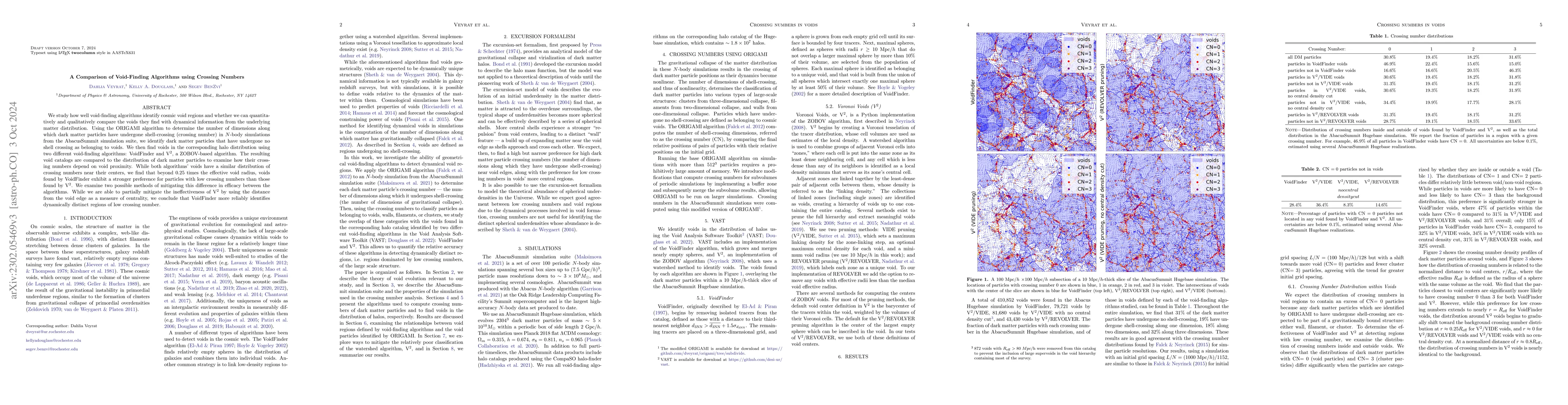 This paper investigates the effectiveness of void-finding algorithms in identifying cosmic voids by comparing them with the crossing number of dark matter particles. It finds that VoidFinder is more effective than V$^2$ in identifying regions with low crossing numbers, especially beyond 0.25 times the effective void radius, and explores methods to mitigate the differences in performance between the two algorithms.
