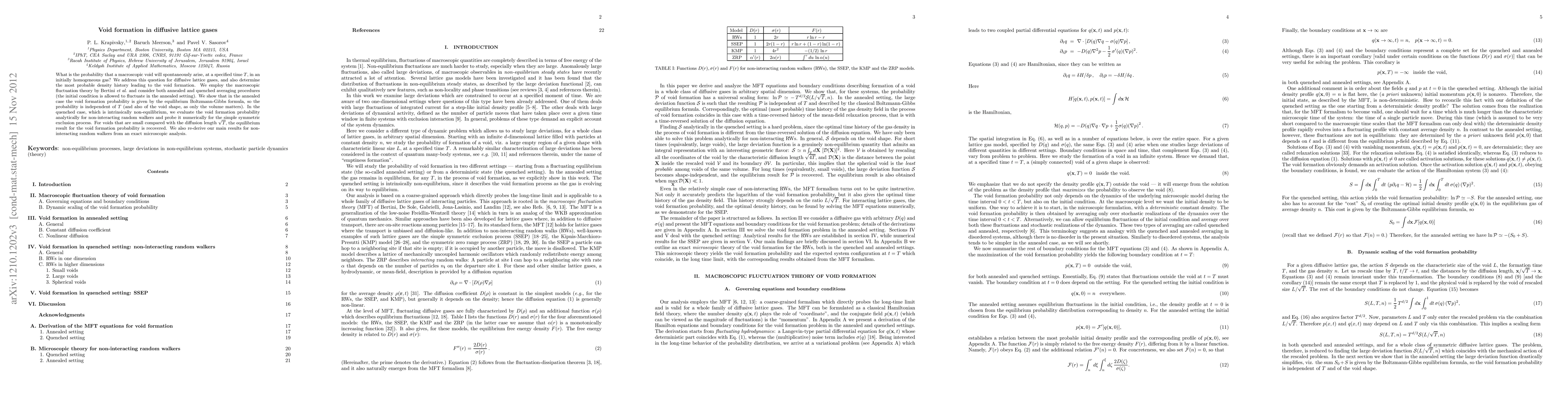 What is the probability that a macroscopic void will spontaneously arise, at a specified time T, in an initially homogeneous gas? We address this question for diffusive lattice gases, and also determine the most probable density history leading to the void formation. We employ the macroscopic fluctuation theory by Bertini et al and consider both annealed and quenched averaging procedures (the initial condition is allowed to fluctuate in the annealed setting). We show that in the annealed case the void formation probability is given by the equilibrium Boltzmann-Gibbs formula, so the probability is independent of T (and also of the void shape, as only the volume matters). In the quenched case, which is intrinsically non-equilibrium, we evaluate the void formation probability analytically for non-interacting random walkers and probe it numerically for the simple symmetric exclusion process. For voids that are small compared with the diffusion length, the equilibrium result for the void formation probability is recovered. We also re-derive our main results for non-interacting random walkers from an exact microscopic analysis.
