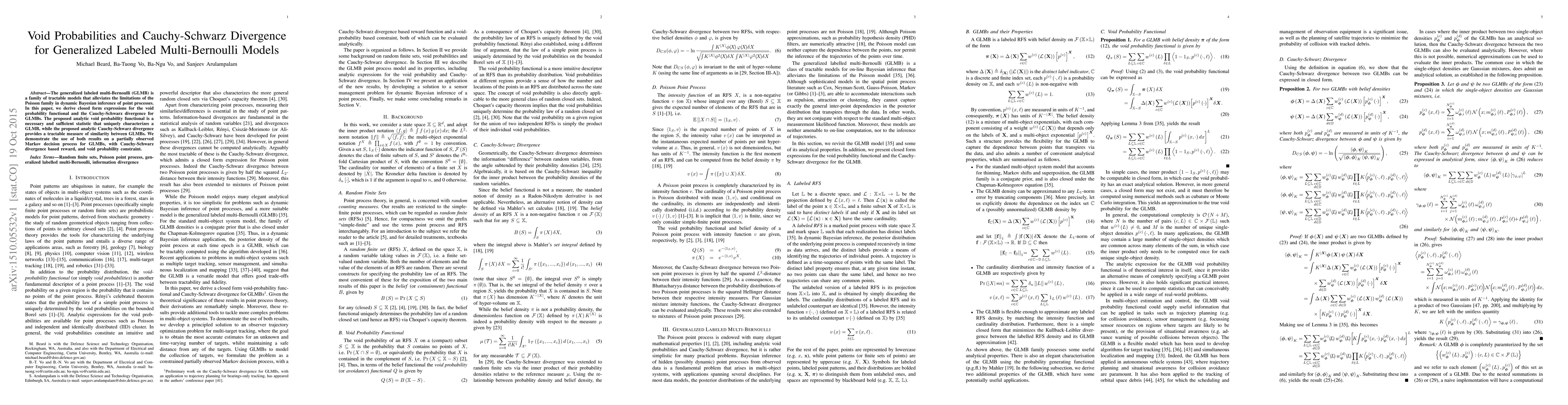 This paper derives closed-form expressions for the void probability functional and Cauchy-Schwarz divergence for generalized labeled multi-Bernoulli models, providing a unique characterization and a measure of similarity between these models. The results are applied to a partially observed Markov decision process with a reward based on Cauchy-Schwarz divergence and a void probability constraint.