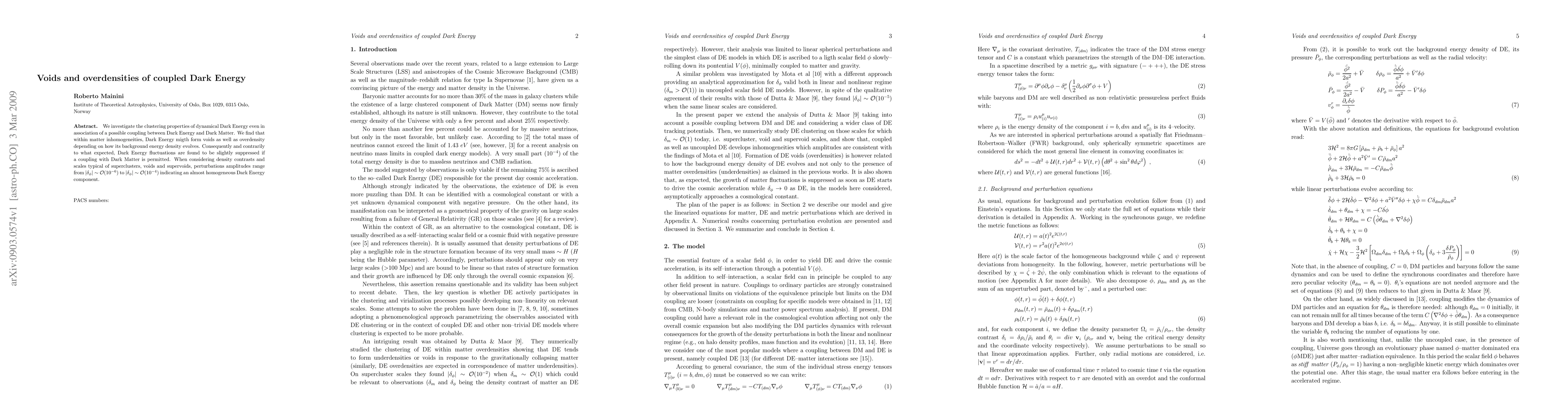This paper explores the clustering behavior of Dark Energy, considering its potential coupling with Dark Matter, and finds that Dark Energy can form voids and overdensities depending on its evolution. Surprisingly, coupling with Dark Matter slightly suppresses Dark Energy fluctuations, with perturbation amplitudes ranging from $10^{-6}$ to $10^{-4}$ on supercluster scales.