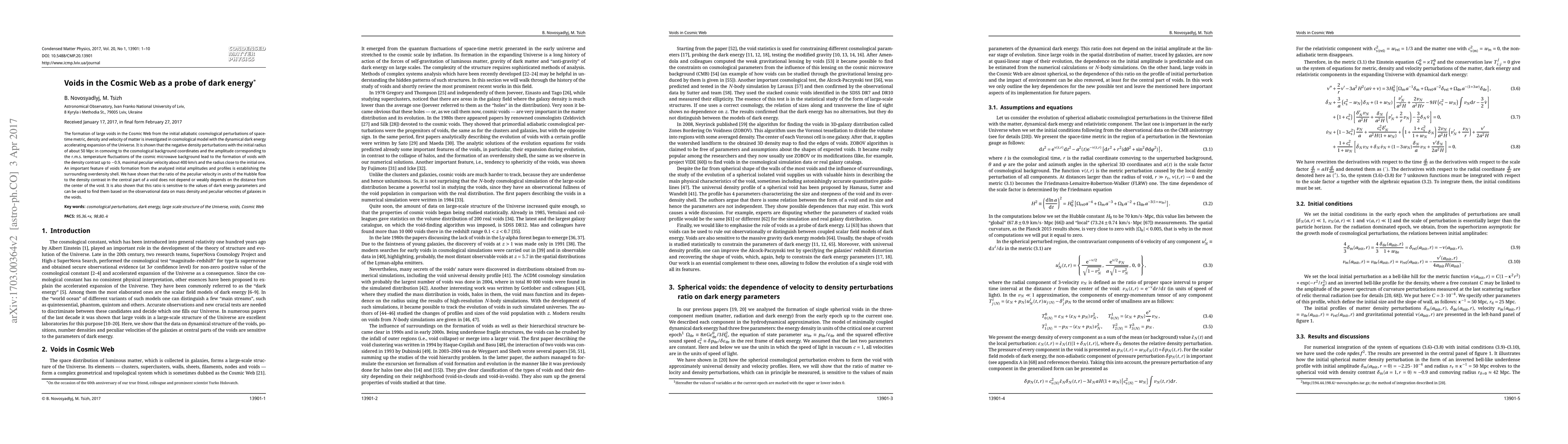 The formation of large voids in the Cosmic Web from the initial adiabatic cosmological perturbations of space-time metric, density and velocity of matter is investigated in cosmological model with the dynamical dark energy accelerating expansion of the Universe. It is shown that the negative density perturbations with the initial radius of about 50 Mpc in comoving to the cosmological background coordinates and the amplitude corresponding to the r.m.s. temperature fluctuations of the cosmic microwave background lead to the formation of voids with the density contrast up to $-$0.9, maximal peculiar velocity about 400 km/s and the radius close to the initial one. An important feature of voids formation from the analyzed initial amplitudes and profiles is establishing the surrounding overdensity shell. We have shown that the ratio of the peculiar velocity in units of the Hubble flow to the density contrast in the central part of a void does not depend or weakly depends on the distance from the center of the void. It is also shown that this ratio is sensitive to the values of dark energy parameters and can be used to find them based on the observational data on mass density and peculiar velocities of galaxies in the voids.