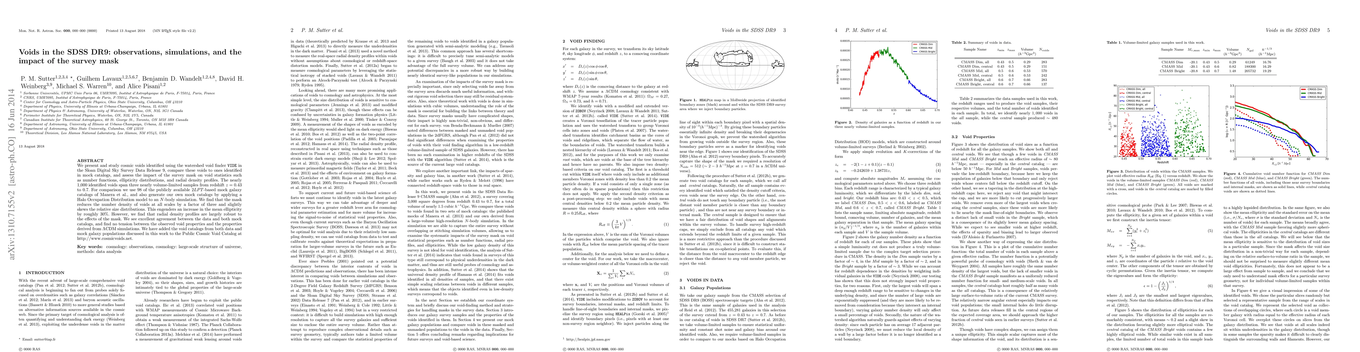 We present and study cosmic voids identified using the watershed void finder VIDE in the Sloan Digital Sky Survey Data Release 9, compare these voids to ones identified in mock catalogs, and assess the impact of the survey mask on void statistics such as number functions, ellipticity distributions, and radial density profiles. The nearly 1,000 identified voids span three nearly volume-limited samples from redshift z = 0.43 to 0.7. For comparison we use 98 of the publicly available 2LPT-based mock galaxy catalogs of Manera et al., and also generate our own mock catalogs by applying a Halo Occupation Distribution model to an N-body simulation. We find that the mask reduces the number density of voids at all scales by a factor of three and slightly skews the relative size distributions. This engenders an increase in the mean ellipticity by roughly 30%. However, we find that radial density profiles are largely robust to the effects of the mask. We see excellent agreement between the data and both mock catalogs, and find no tension between the observed void properties and the properties derived from {\Lambda}CDM simulations. We have added the void catalogs from both data and mock galaxy populations discussed in this work to the Public Cosmic Void Catalog at http://www.cosmicvoids.net.