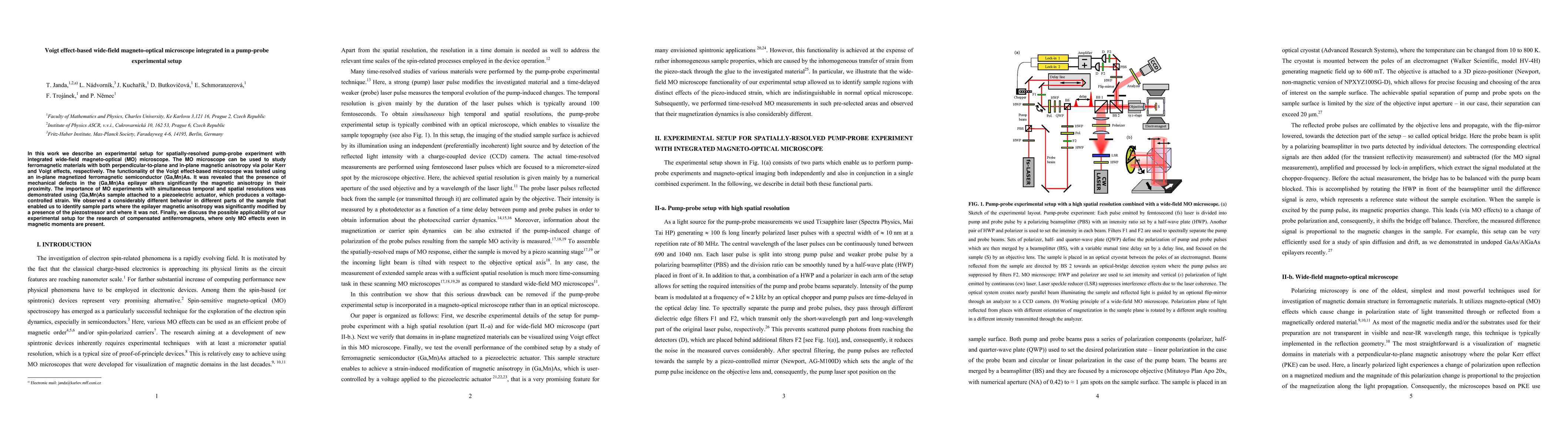 In this work we describe an experimental setup for spatially-resolved pump-probe experiment with integrated wide-field magneto-optical (MO) microscope. The MO microscope can be used to study ferromagnetic materials with both perpendicular-to-plane and in-plane magnetic anisotropy via polar Kerr and Voigt effects, respectively. The functionality of the Voigt effect-based microscope was tested using an in-plane magnetized ferromagnetic semiconductor (Ga,Mn)As. It was revealed that the presence of mechanical defects in the (Ga,Mn)As epilayer alters significantly the magnetic anisotropy in their proximity. The importance of MO experiments with simultaneous temporal and spatial resolutions was demonstrated using (Ga,Mn)As sample attached to a piezoelectric actuator, which produces a voltage-controlled strain. We observed a considerably different behavior in different parts of the sample that enabled us to identify sample parts where the epilayer magnetic anisotropy was significantly modified by a presence of the piezostressor and where it was not. Finally, we discuss the possible applicability of our experimental setup for the research of compensated antiferromagnets, where only MO effects even in magnetic moments are present.
