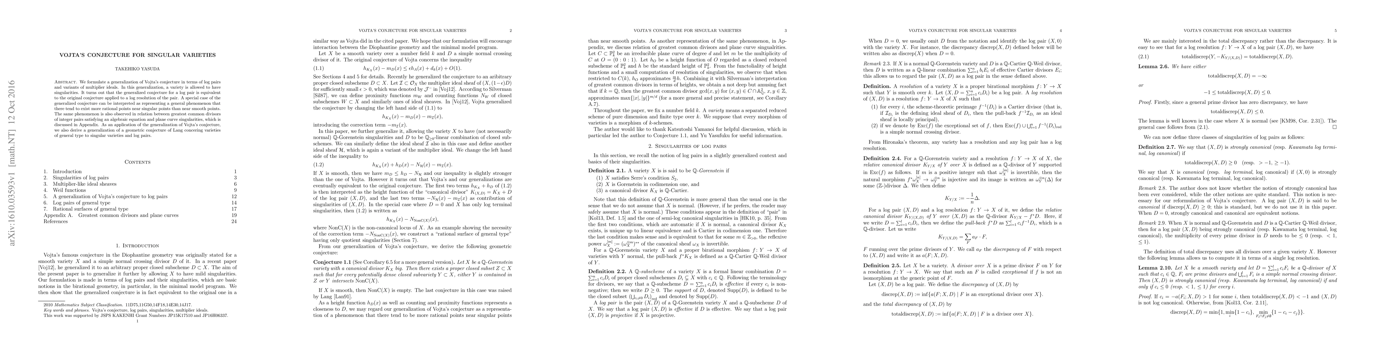 The paper generalizes Vojta's conjecture for singular varieties using log pairs and multiplier-like ideals, establishing an equivalence between the generalized conjecture for a log pair and the original conjecture applied to a log resolution of the pair.