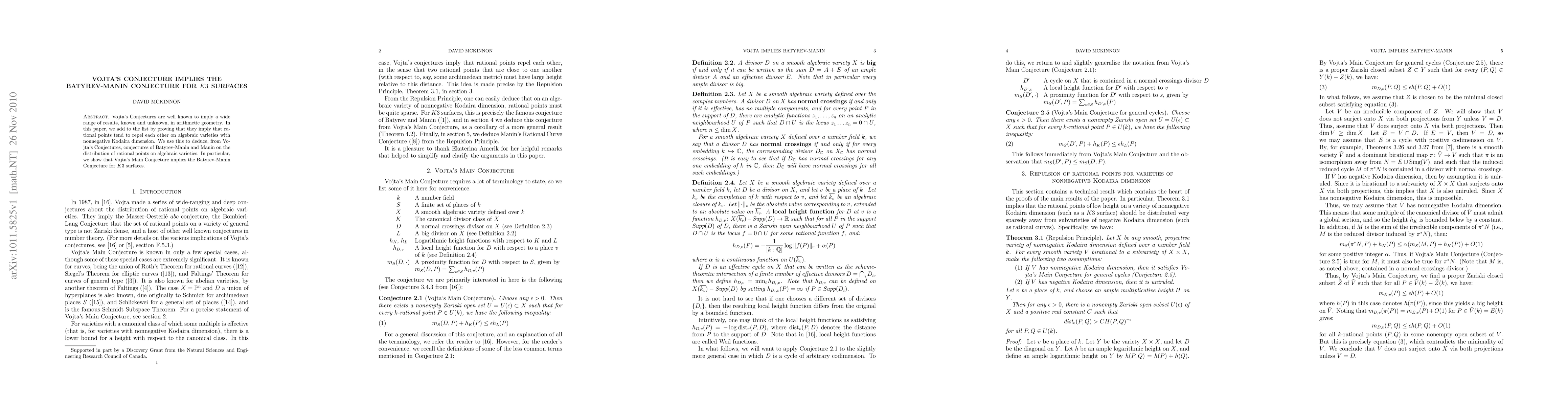 Vojta's Conjectures imply that rational points tend to repel on algebraic varieties with nonnegative Kodaira dimension, leading to the conclusion that Vojta's Main Conjecture supports the Batyrev-Manin Conjecture specifically for $K3$ surfaces.