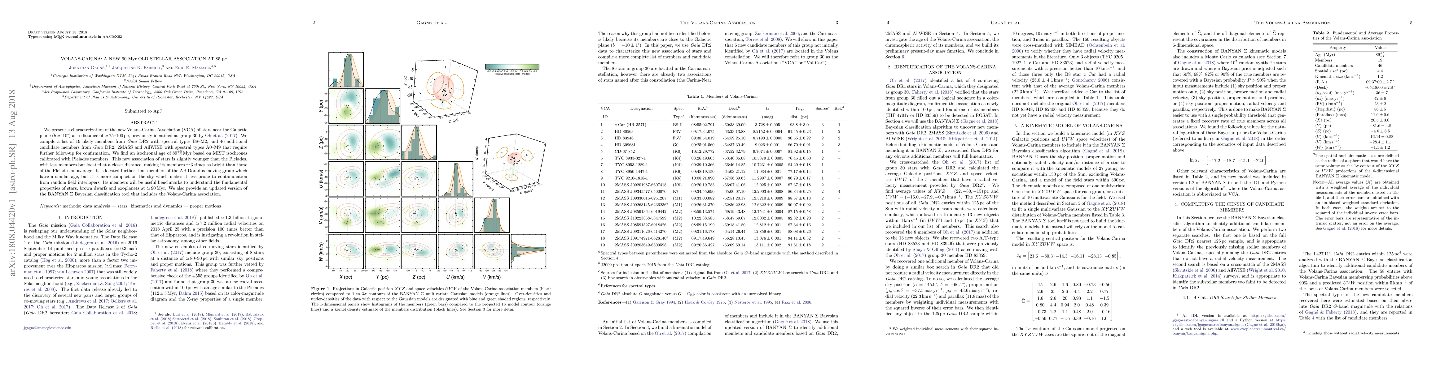 We present a characterization of the new Volans-Carina Association (VCA) of stars near the Galactic plane (b ~ -10 deg) at a distance of ~75-100 pc, previously identified as group 30 by Oh et al. (2017). We compile a list of 19 likely members from Gaia DR2 with spectral types B8-M2, and 46 additional candidate members from Gaia DR2, 2MASS and AllWISE with spectral types A0-M9 that require further follow-up for confirmation. We find an isochronal age of $89_{-7}^{+5}$ Myr based on MIST isochrones calibrated with Pleiades members. This new association of stars is slightly younger than the Pleiades, with less members but located at a closer distance, making its members ~3 times as bright than those of the Pleiades on average. It is located further than members of the AB Doradus moving group which have a similar age, but it is more compact on the sky which makes it less prone to contamination from random field interlopers. Its members will be useful benchmarks to understand the fundamental properties of stars, brown dwarfs and exoplanets at ~90 Myr. We also provide an updated version of the BANYAN $\Sigma$ Bayesian classification tool that includes the Volans-Carina association.