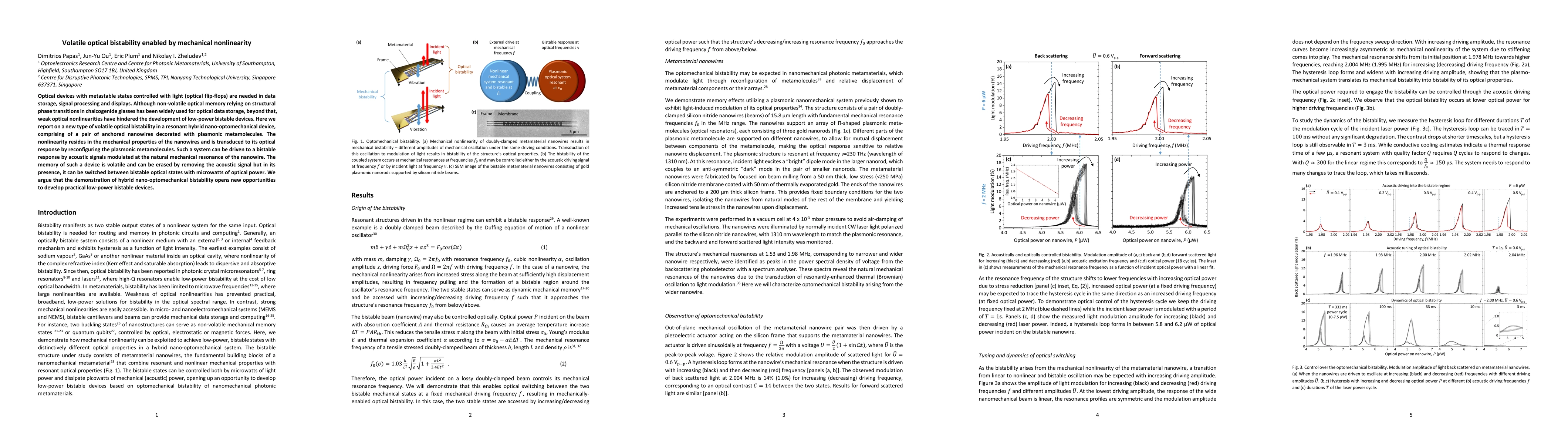 This paper reports on a novel volatile optical bistability in a hybrid nano-optomechanical device, utilizing mechanical nonlinearity in nanowires to achieve optical memory states with low-power optical inputs. The device can be switched between bistable states using microwatts of optical power, offering potential for low-power optical data storage and processing.
