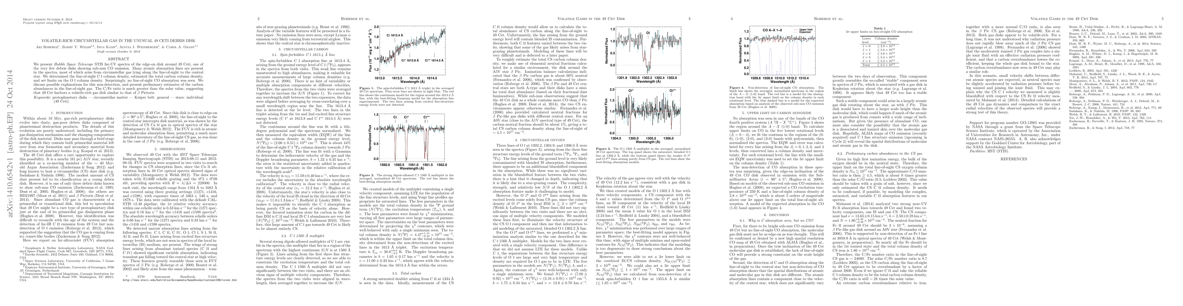 We present Hubble Space Telescope STIS far-UV spectra of the edge-on disk around 49 Ceti, one of the very few debris disks showing sub-mm CO emission. Many atomic absorption lines are present in the spectra, most of which arise from circumstellar gas lying along the line-of-sight to the central star. We determined the line-of-sight CI column density, estimated the total carbon column density, and set limits on the OI column density. Surprisingly, no line-of-sight CO absorption was seen. We discuss possible explanations for this non-detection, and present preliminary estimates of the carbon abundances in the line-of-sight gas. The C/Fe ratio is much greater than the solar value, suggesting that 49 Cet harbors a volatile-rich gas disk similar to that of Beta Pictoris.