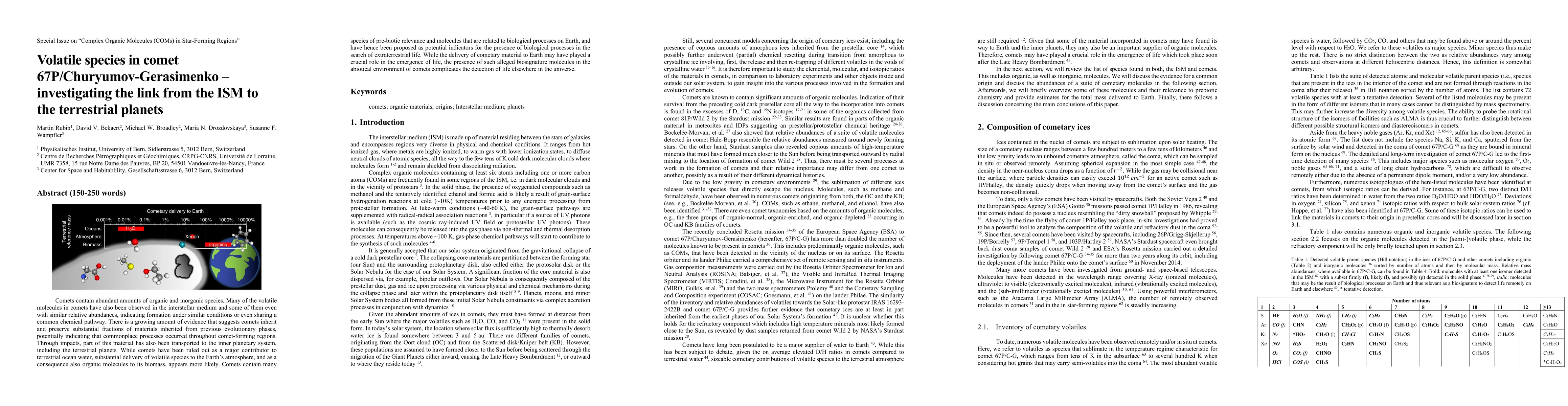 Comets contain abundant amounts of organic and inorganic species. Many of the volatile molecules in comets have also been observed in the interstellar medium and some of them even with similar relative abundances, indicating formation under similar conditions or even sharing a common chemical pathway. There is a growing amount of evidence that suggests comets inherit and preserve substantial fractions of materials inherited from previous evolutionary phases, potentially indicating that commonplace processes occurred throughout comet-forming regions. Through impacts, part of this material has also been transported to the inner planetary system, including the terrestrial planets. While comets have been ruled out as a major contributor to terrestrial ocean water, substantial delivery of volatile species to the Earth's atmosphere, and as a consequence also organic molecules to its biomass, appears more likely. Comets contain many species of pre-biotic relevance and molecules that are related to biological processes on Earth, and have hence been proposed as potential indicators for the presence of biological processes in the search of extraterrestrial life. While the delivery of cometary material to Earth may have played a crucial role in the emergence of life, the presence of such alleged biosignature molecules in the abiotical environment of comets complicates the detection of life elsewhere in the universe.