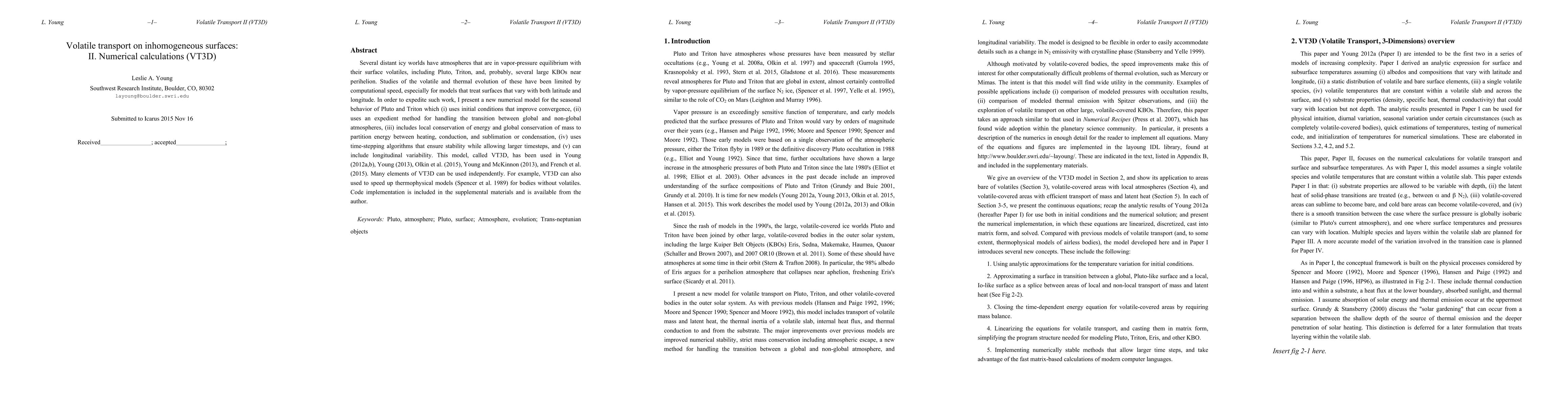 Several distant icy worlds have atmospheres that are in vapor-pressure equilibrium with their surface volatiles, including Pluto, Triton, and, probably, several large KBOs near perihelion. Studies of the volatile and thermal evolution of these have been limited by computational speed, especially for models that treat surfaces that vary with both latitude and longitude. In order to expedite such work, I present a new numerical model for the seasonal behavior of Pluto and Triton which (i) uses initial conditions that improve convergence, (ii) uses an expedient method for handling the transition between global and non-global atmospheres, (iii) includes local conservation of energy and global conservation of mass to partition energy between heating, conduction, and sublimation or condensation, (iv) uses time-stepping algorithms that ensure stability while allowing larger timesteps, and (v) can include longitudinal variability. This model, called VT3D, has been used in Young (2012), Young (2013), Olkin et al. (2015), Young and McKinnon (2013), and French et al. (2015).