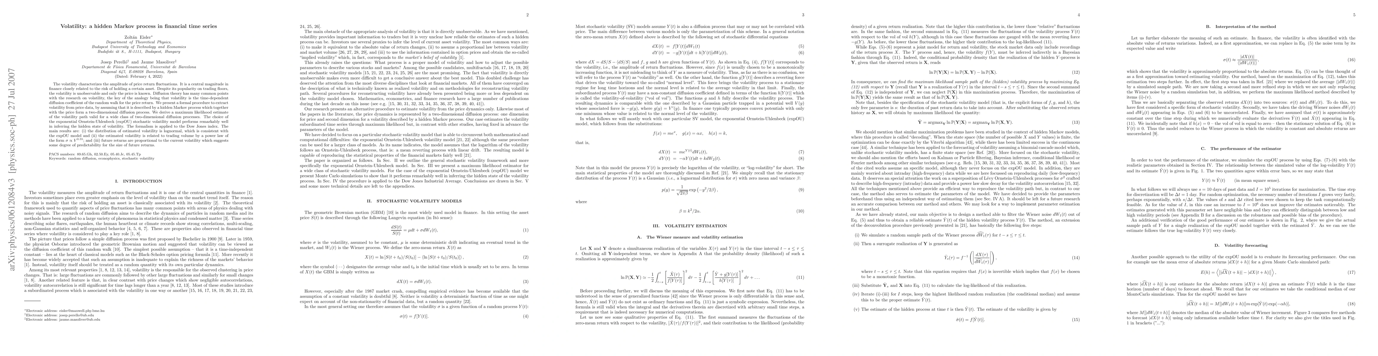This paper proposes a hidden Markov process to model volatility as an unobservable time-dependent diffusion coefficient in financial time series. The exponential Ornstein-Uhlenbeck model effectively infers volatility from price data, revealing a lognormal distribution and a power law relationship between volatility and trading volume.