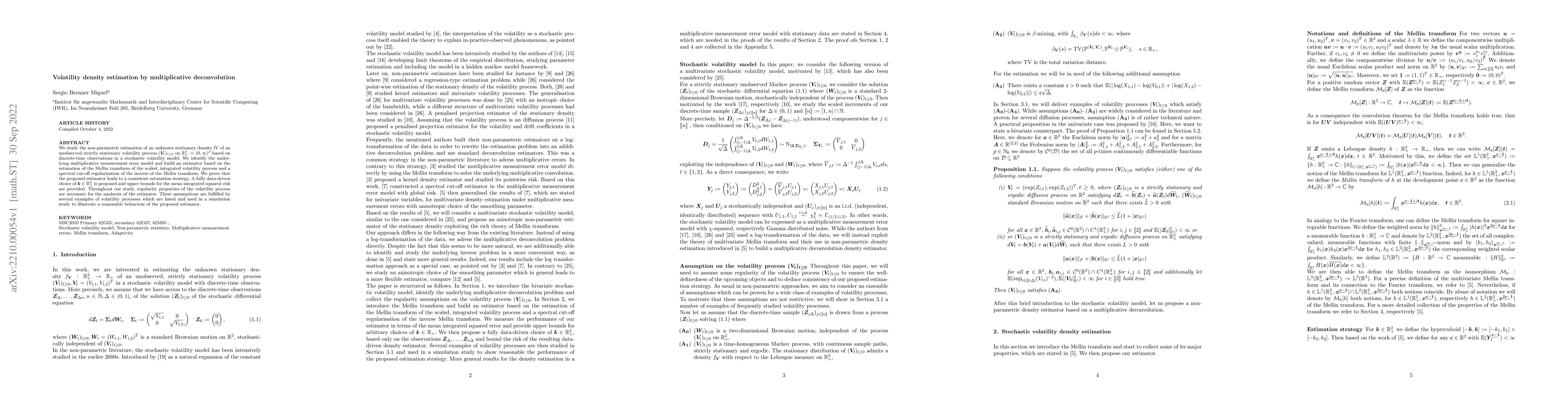 We study the non-parametric estimation of an unknown stationary density fV of an unobserved strictly stationary volatility process $(\bm V_t)_{t\geq 0}$ on $\IRp^2 := (0,\infty)^2$ based on discrete-time observations in a stochastic volatility model. We identify the underlying multiplicative measurement error model and build an estimator based on the estimation of the Mellin transform of the scaled, integrated volatility process and a spectral cut-off regularisation of the inverse of the Mellin transform. We prove that the proposed estimator leads to a consistent estimation strategy. A fully data-driven choice of $\bm k \in \IRp^2$ is proposed and upper bounds for the mean integrated squared risk are provided. Throughout our study, regularity properties of the volatility process are necessary for the analsysis of the estimator. These assumptions are fulfilled by several examples of volatility processes which are listed and used in a simulation study to illustrate a reasonable behaviour of the proposed estimator.