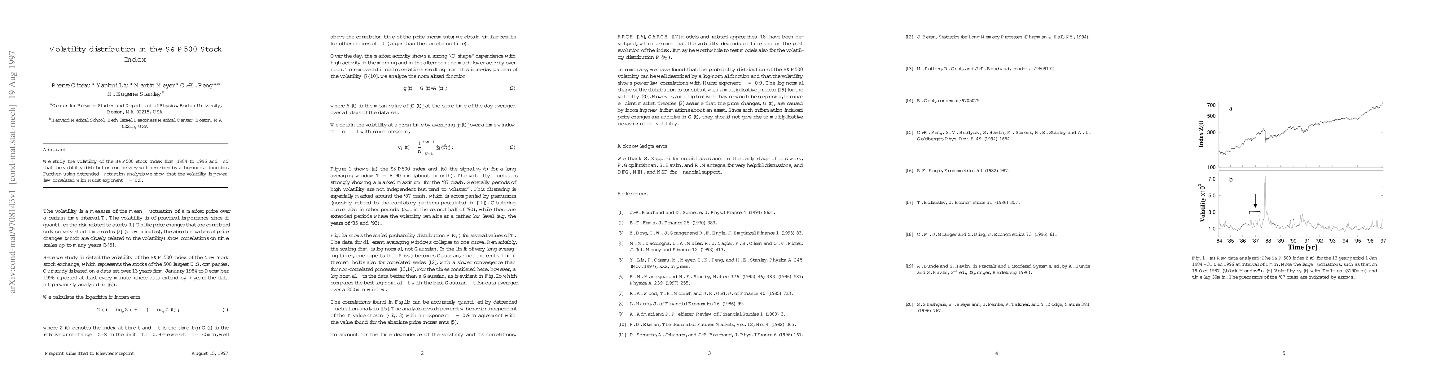 The S&P500 stock index shows log-normal volatility distribution from 1984 to 1996, with power-law correlations detected using detrended fluctuation analysis, suggesting a Hurst exponent of approximately 0.9.