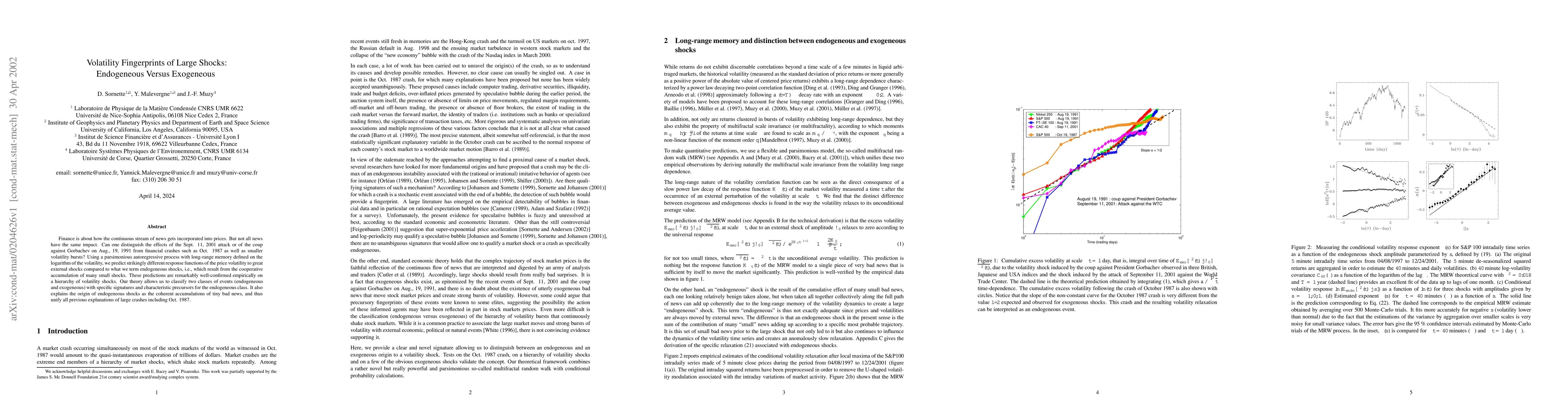 Finance is about how the continuous stream of news gets incorporated into prices. But not all news have the same impact. Can one distinguish the effects of the Sept. 11, 2001 attack or of the coup against Gorbachev on Aug., 19, 1991 from financial crashes such as Oct. 1987 as well as smaller volatility bursts? Using a parsimonious autoregressive process with long-range memory defined on the logarithm of the volatility, we predict strikingly different response functions of the price volatility to great external shocks compared to what we term endogeneous shocks, i.e., which result from the cooperative accumulation of many small shocks. These predictions are remarkably well-confirmed empirically on a hierarchy of volatility shocks. Our theory allows us to classify two classes of events (endogeneous and exogeneous) with specific signatures and characteristic precursors for the endogeneous class. It also explains the origin of endogeneous shocks as the coherent accumulations of tiny bad news, and thus unify all previous explanations of large crashes including Oct. 1987.
