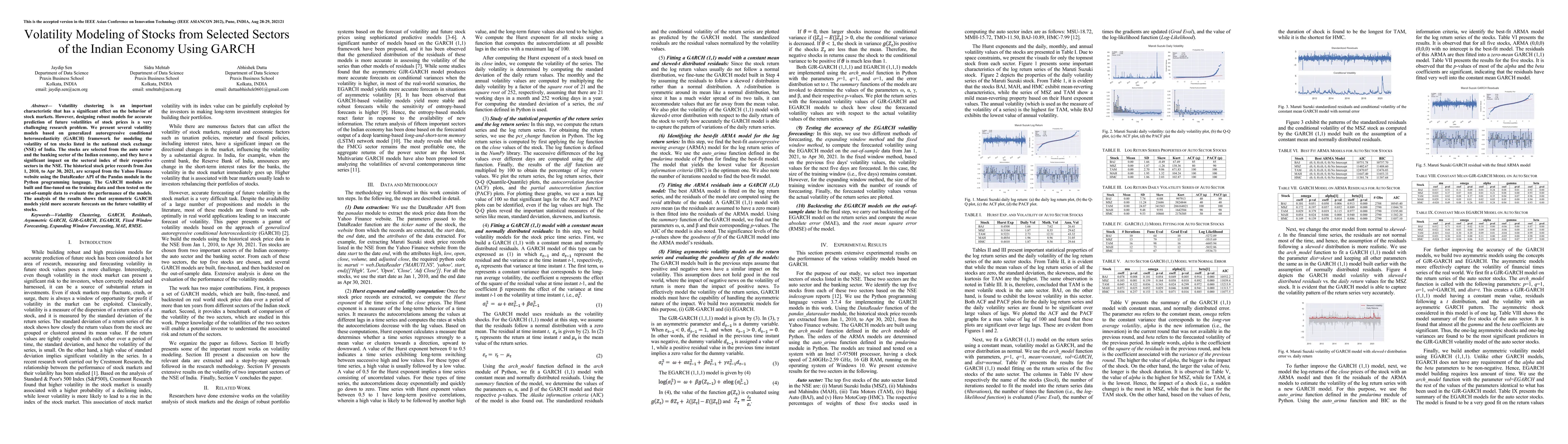 This paper explores the use of GARCH models to predict the volatility of stocks from India's auto and banking sectors, finding that asymmetric GARCH models provide more accurate forecasts compared to other GARCH variants. Historical stock data from 2010 to 2021 were analyzed to develop and test these models.