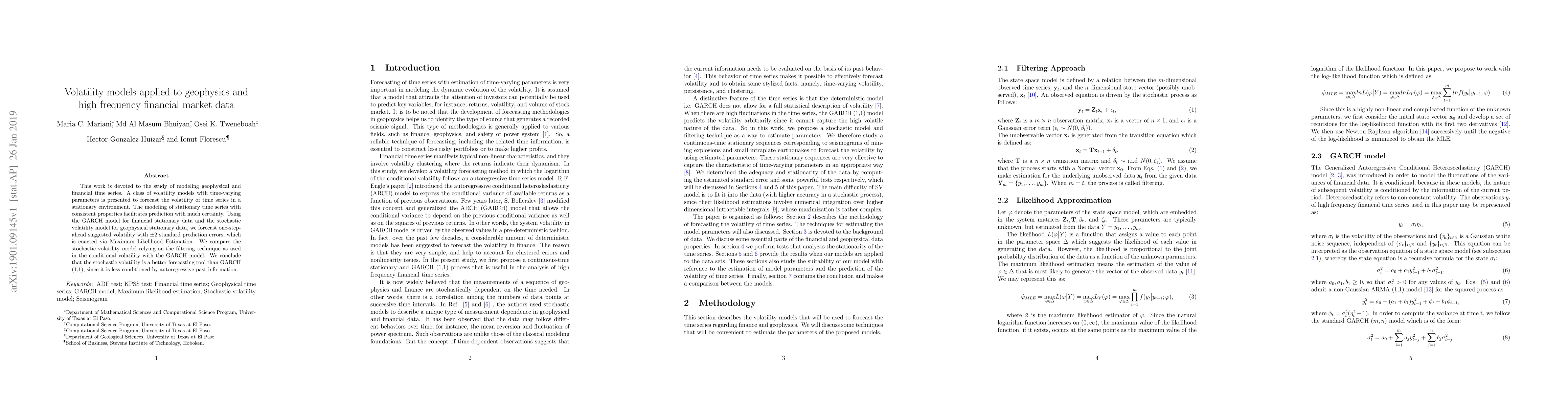 This work is devoted to the study of modeling geophysical and financial time series. A class of volatility models with time-varying parameters is presented to forecast the volatility of time series in a stationary environment. The modeling of stationary time series with consistent properties facilitates prediction with much certainty. Using the GARCH and stochastic volatility model, we forecast one-step-ahead suggested volatility with +/- 2 standard prediction errors, which is enacted via Maximum Likelihood Estimation. We compare the stochastic volatility model relying on the filtering technique as used in the conditional volatility with the GARCH model. We conclude that the stochastic volatility is a better forecasting tool than GARCH (1, 1), since it is less conditioned by autoregressive past information.