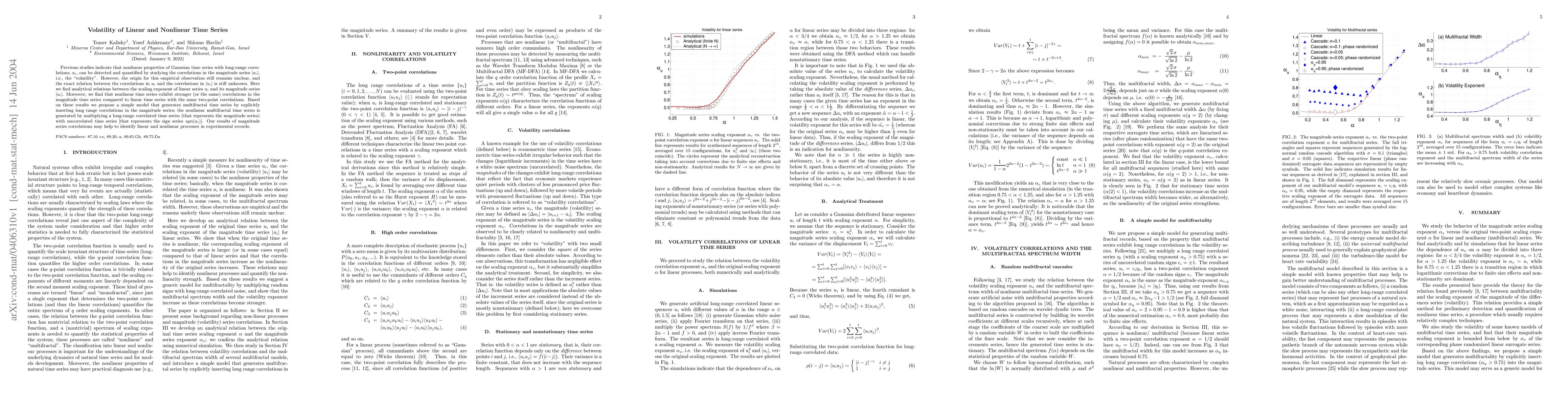 Previous studies indicate that nonlinear properties of Gaussian time series with long-range correlations, $u_i$, can be detected and quantified by studying the correlations in the magnitude series $|u_i|$, i.e., the ``volatility''. However, the origin for this empirical observation still remains unclear, and the exact relation between the correlations in $u_i$ and the correlations in $|u_i|$ is still unknown. Here we find analytical relations between the scaling exponent of linear series $u_i$ and its magnitude series $|u_i|$. Moreover, we find that nonlinear time series exhibit stronger (or the same) correlations in the magnitude time series compared to linear time series with the same two-point correlations. Based on these results we propose a simple model that generates multifractal time series by explicitly inserting long range correlations in the magnitude series; the nonlinear multifractal time series is generated by multiplying a long-range correlated time series (that represents the magnitude series) with uncorrelated time series [that represents the sign series $sgn(u_i)$]. Our results of magnitude series correlations may help to identify linear and nonlinear processes in experimental records.