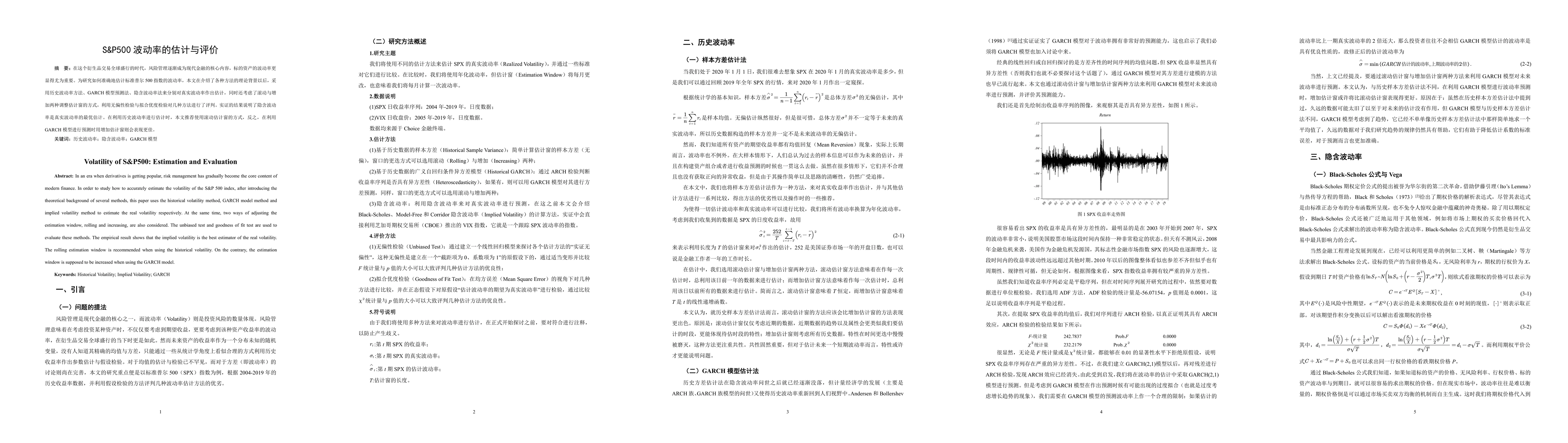 The study compares three methods to estimate S&P 500 volatility: historical volatility, GARCH model, and implied volatility. It finds that implied volatility is the best estimator, with rolling estimation window recommended for historical volatility.