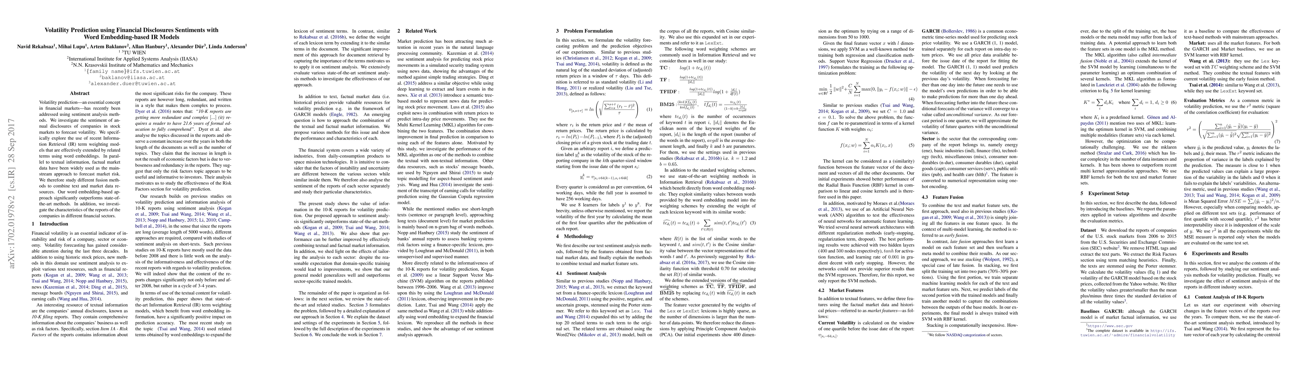 This paper explores predicting stock market volatility using sentiment analysis of companies' annual disclosures, enhanced by word embedding-based Information Retrieval models. The study combines textual sentiment data with market data, demonstrating superior performance compared to existing methods and analyzing sector-specific report characteristics.