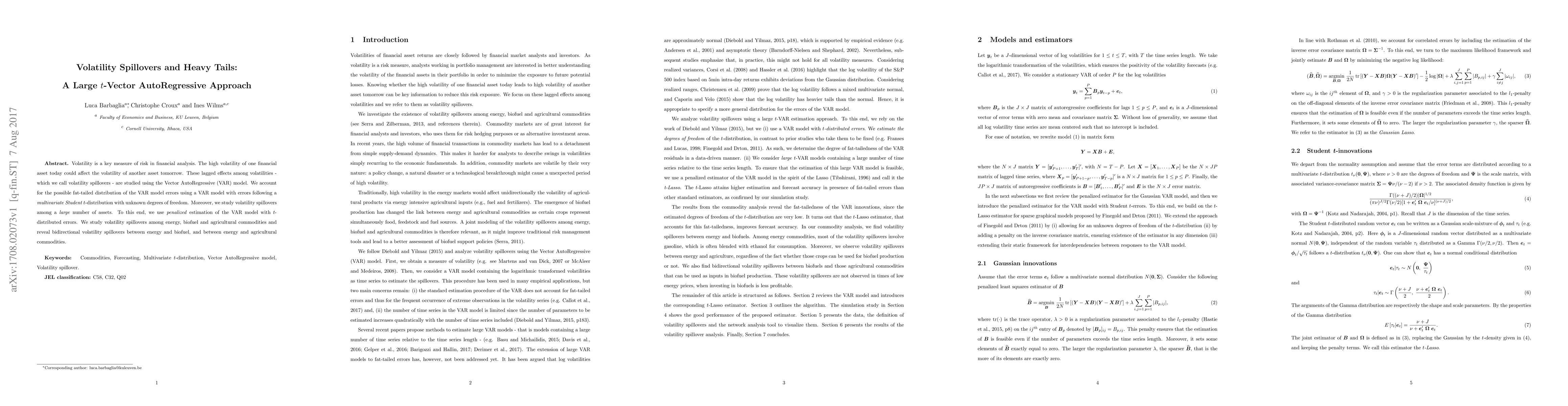 Volatility is a key measure of risk in financial analysis. The high volatility of one financial asset today could affect the volatility of another asset tomorrow. These lagged effects among volatilities - which we call volatility spillovers - are studied using the Vector AutoRegressive (VAR) model. We account for the possible fat-tailed distribution of the VAR model errors using a VAR model with errors following a multivariate Student t-distribution with unknown degrees of freedom. Moreover, we study volatility spillovers among a large number of assets. To this end, we use penalized estimation of the VAR model with t-distributed errors. We study volatility spillovers among energy, biofuel and agricultural commodities and reveal bidirectional volatility spillovers between energy and biofuel, and between energy and agricultural commodities.
