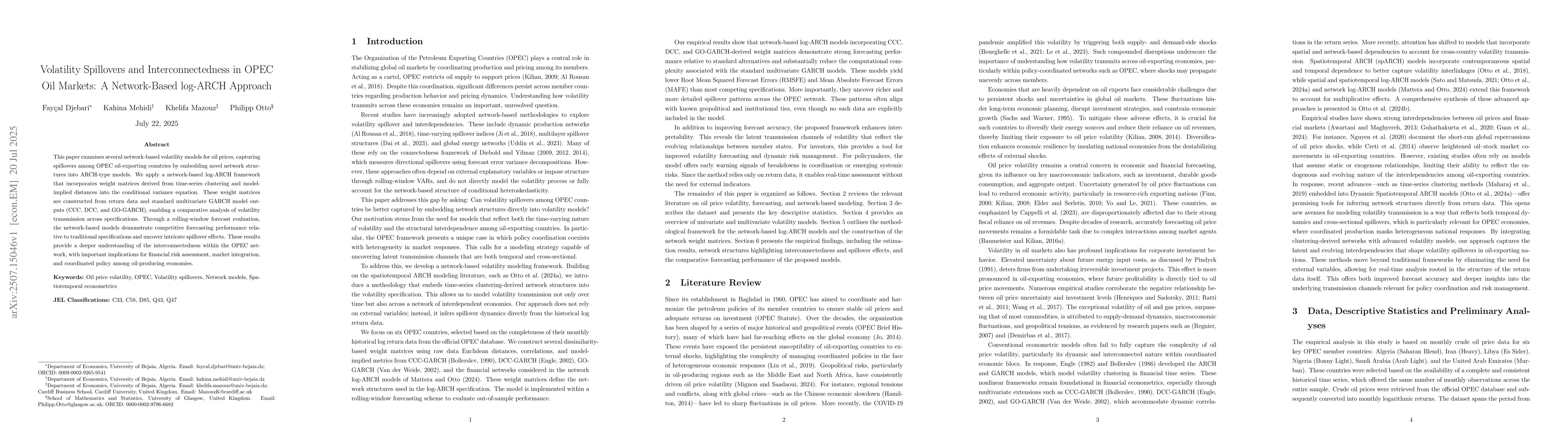 This paper examines several network-based volatility models for oil prices, capturing spillovers among OPEC oil-exporting countries by embedding novel network structures into ARCH-type models. We apply a network-based log-ARCH framework that incorporates weight matrices derived from time-series clustering and model-implied distances into the conditional variance equation. These weight matrices are constructed from return data and standard multivariate GARCH model outputs (CCC, DCC, and GO-GARCH), enabling a comparative analysis of volatility transmission across specifications. Through a rolling-window forecast evaluation, the network-based models demonstrate competitive forecasting performance relative to traditional specifications and uncover intricate spillover effects. These results provide a deeper understanding of the interconnectedness within the OPEC network, with important implications for financial risk assessment, market integration, and coordinated policy among oil-producing economies.