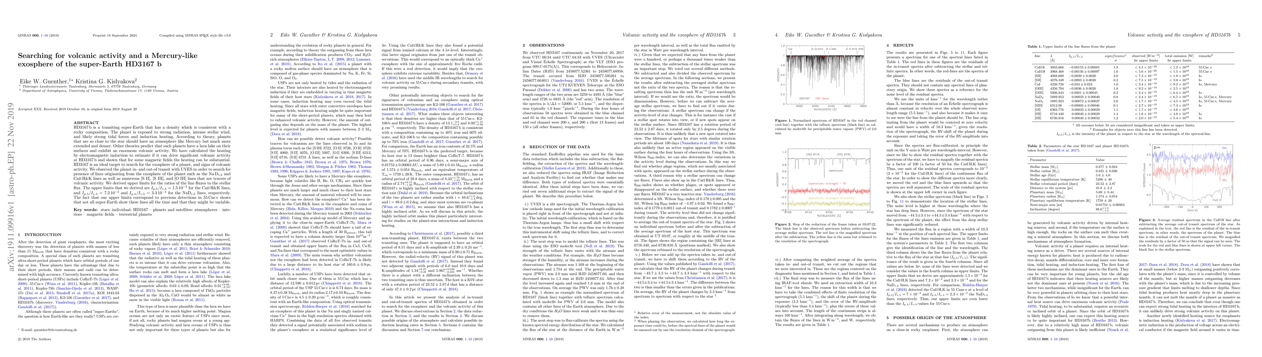 HD3167b is a transiting super-Earth that has a density which is consistent with a rocky composition. The planet is exposed to strong radiation, intense stellar wind, and likely strong tidal forces and induction heating. According to theory, planets that are so close to the star should have an atmosphere like Mercury but much more extended and denser. Other theories predict that such planets have a lava lake on their surfaces and exhibit an enormous volcanic activity. We have calculated the heating by electromagnetic induction to estimate if it can drive significant volcanic activity at HD3167b and shown that for some magnetic fields the heating can be substantial. HD3167 is an ideal target to search for the exosphere of a planet, and signs of volcanic activity. We observed the planet in-and out-of transit with UVES in order to search for presence of lines originating from the exosphere of the planet such as the NaD1,2 and CaIIH&K lines as well as numerous [S II],[S III], and [O III] lines that are tracers of volcanic activity. We derived upper limits for the ratios of the line fluxes to the stellar flux. The upper limits that we derived are Ip,lambda/I*,lambda=1.5 10-3 for the CaII,H&K lines, and I_p,lambda/I*,lambda=7.2 10-4 and I_p,lambda/I_*,lambda=3.3 10-4 for the NaD_1,2 lines, respectively. The fact that our upper limits correspond to previous detections in 55 Cnc e shows that not all super-Earth show these lines all the time and that they might be variable.