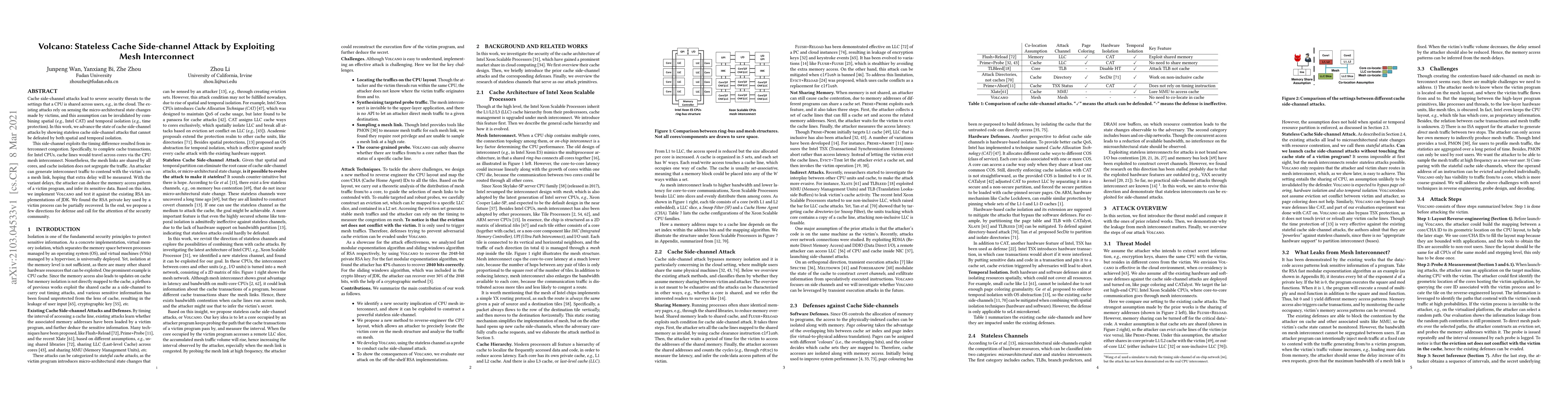 Volcano demonstrates a novel stateless cache side-channel attack that exploits timing differences due to mesh interconnect congestion on Intel CPUs, bypassing both spatial and temporal isolation. The attack infers sensitive data by inducing delays in cache line travel, successfully recovering parts of RSA private keys in tested JDK implementations.