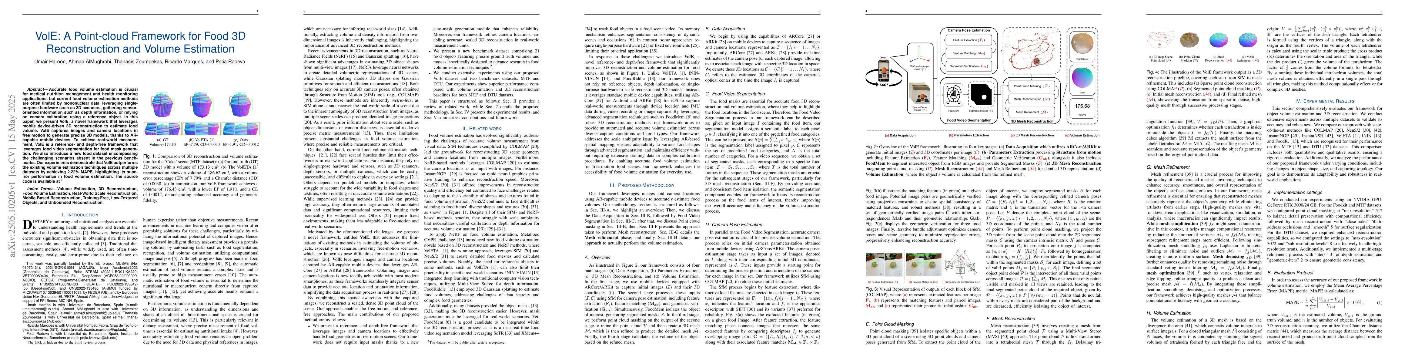 VolE presents a novel point-cloud framework for food 3D reconstruction and volume estimation, leveraging mobile device capabilities and food video segmentation for precise, reference- and depth-free volume estimations.