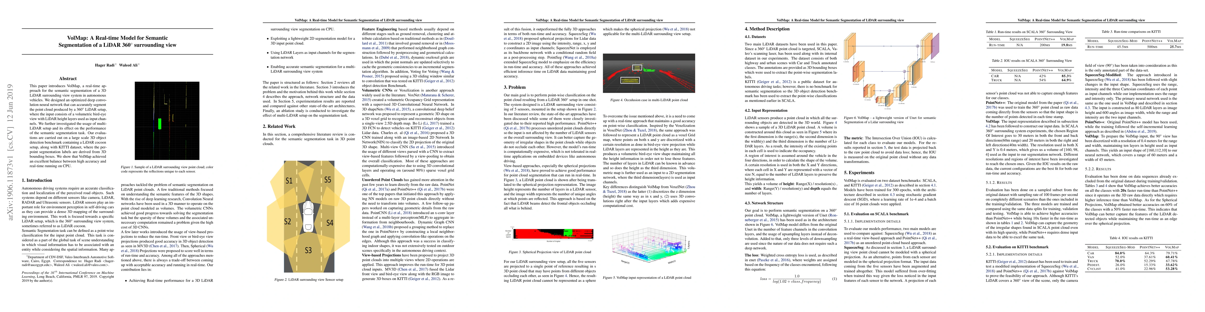 VolMap is a real-time deep learning model for semantic segmentation of 3D LiDAR surrounding views in autonomous vehicles. It uses a volumetric bird-eye view with LiDAR height layers as input and demonstrates high accuracy and real-time performance on CPU, evaluated on large-scale datasets.