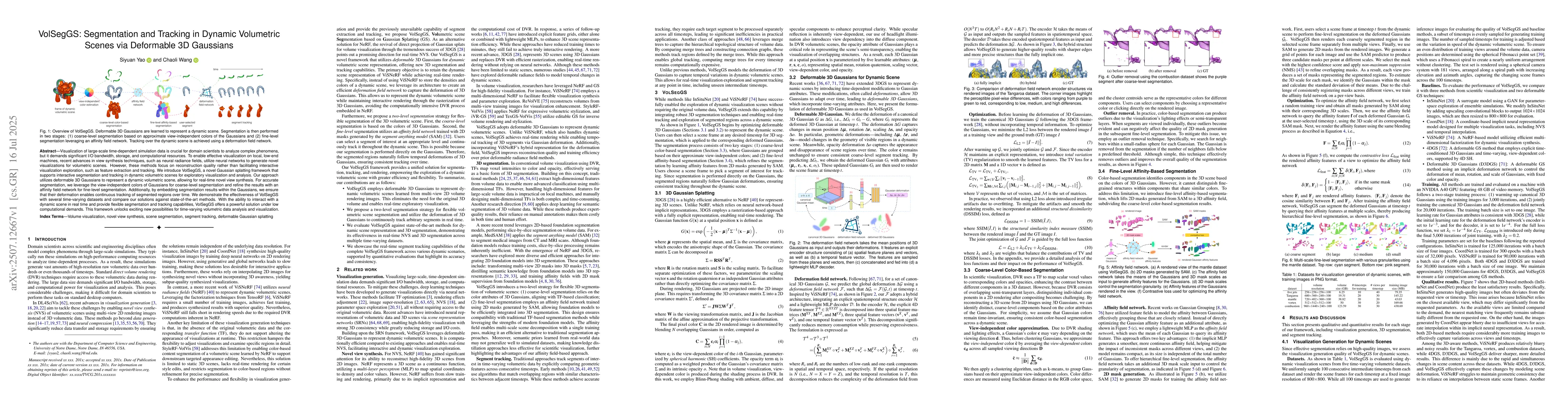 Visualization of large-scale time-dependent simulation data is crucial for domain scientists to analyze complex phenomena, but it demands significant I/O bandwidth, storage, and computational resources. To enable effective visualization on local, low-end machines, recent advances in view synthesis techniques, such as neural radiance fields, utilize neural networks to generate novel visualizations for volumetric scenes. However, these methods focus on reconstruction quality rather than facilitating interactive visualization exploration, such as feature extraction and tracking. We introduce VolSegGS, a novel Gaussian splatting framework that supports interactive segmentation and tracking in dynamic volumetric scenes for exploratory visualization and analysis. Our approach utilizes deformable 3D Gaussians to represent a dynamic volumetric scene, allowing for real-time novel view synthesis. For accurate segmentation, we leverage the view-independent colors of Gaussians for coarse-level segmentation and refine the results with an affinity field network for fine-level segmentation. Additionally, by embedding segmentation results within the Gaussians, we ensure that their deformation enables continuous tracking of segmented regions over time. We demonstrate the effectiveness of VolSegGS with several time-varying datasets and compare our solutions against state-of-the-art methods. With the ability to interact with a dynamic scene in real time and provide flexible segmentation and tracking capabilities, VolSegGS offers a powerful solution under low computational demands. This framework unlocks exciting new possibilities for time-varying volumetric data analysis and visualization.