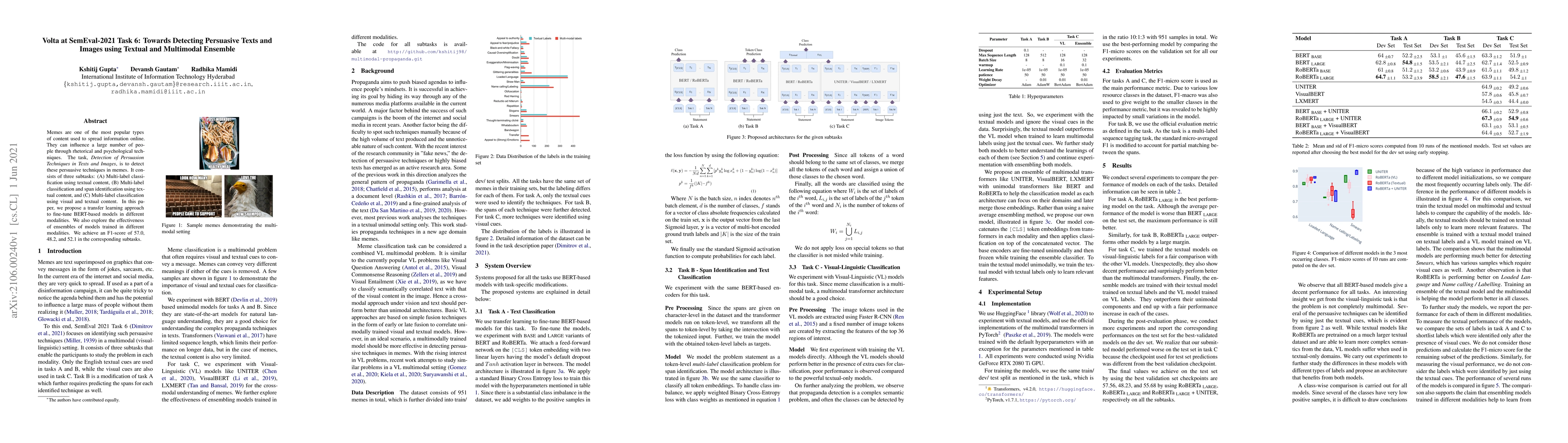 Memes are one of the most popular types of content used to spread information online. They can influence a large number of people through rhetorical and psychological techniques. The task, Detection of Persuasion Techniques in Texts and Images, is to detect these persuasive techniques in memes. It consists of three subtasks: (A) Multi-label classification using textual content, (B) Multi-label classification and span identification using textual content, and (C) Multi-label classification using visual and textual content. In this paper, we propose a transfer learning approach to fine-tune BERT-based models in different modalities. We also explore the effectiveness of ensembles of models trained in different modalities. We achieve an F1-score of 57.0, 48.2, and 52.1 in the corresponding subtasks.