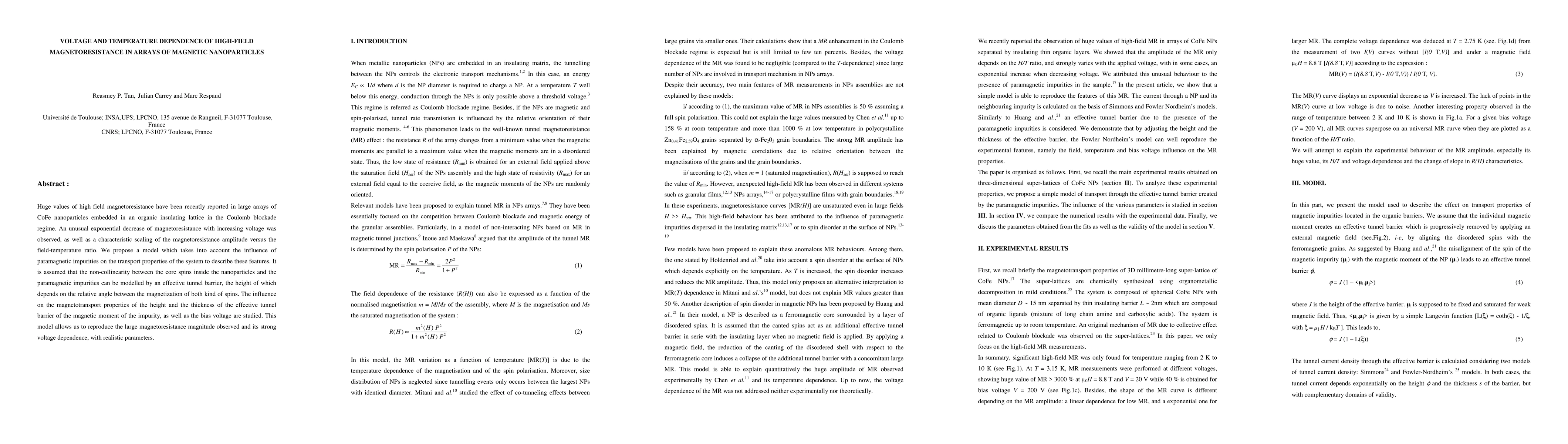 Huge values of high field magnetoresistance have been recently reported in large arrays of CoFe nanoparticles embedded in an organic insulating lattice in the Coulomb blockade regime. An unusual exponential decrease of magnetoresistance with increasing voltage was observed, as well as a characteristic scaling of the magnetoresistance amplitude versus the field-temperature ratio. We propose a model which takes into account the influence of paramagnetic impurities on the transport properties of the system to describe these features. It is assumed that the non-colinearity between the core spins inside the nanoparticles and the paramagnetic impurities can be modelled by an effective tunnel barrier, the height of which depends on the relative angle between the magnetization of both kind of spins. The influence on the magnetotransport properties of the height and the thickness of the effective tunnel barrier of the magnetic moment of the impurity, as well as the bias voltage are studied. This model allows us to reproduce the large magnetoresistance magnitude observed and its strong voltage dependence, with realistic parameters.