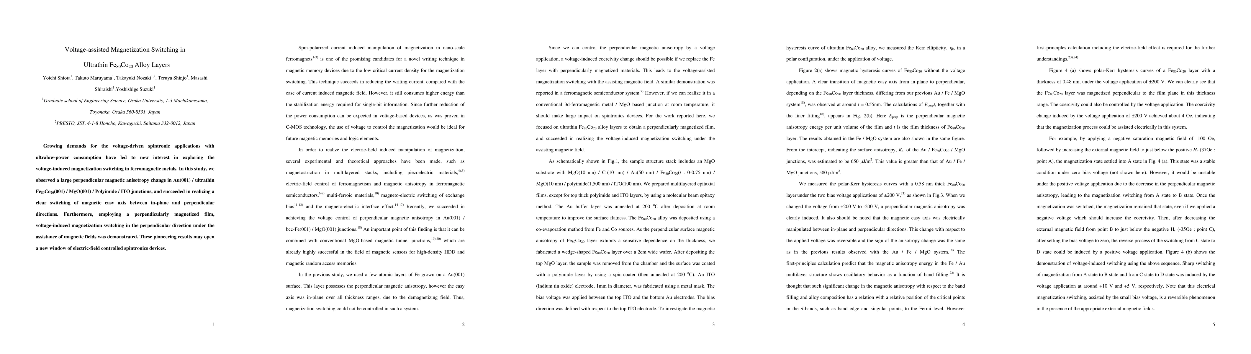This paper investigates voltage-induced magnetization switching in ultrathin Fe80Co20 alloy layers, demonstrating significant perpendicular magnetic anisotropy changes and successful switching of magnetic easy axis with the aid of electric fields and magnetic fields. These findings may pave the way for low-power, electric-field controlled spintronic devices.