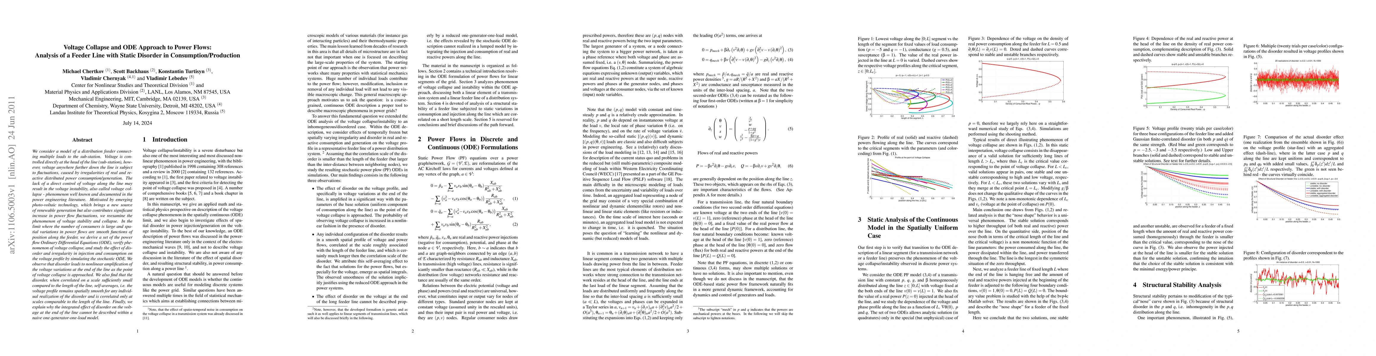 We consider a model of a distribution feeder connecting multiple loads to the sub-station. Voltage is controlled directly at the head of the line (sub-station), however, voltage anywhere further down the line is subject to fluctuations, caused by irregularities of real and reactive distributed power consumption/generation. The lack of a direct control of voltage along the line may result in the voltage instability, also called voltage collapse - phenomenon well known and documented in the power engineering literature. Motivated by emerging photo-voltaic technology, which brings a new source of renewable generation but also contributes significant increase in power flow fluctuations, we reexamine the phenomenon of voltage stability and collapse. In the limit where the number of consumers is large and spatial variations in power flows are smooth functions of position along the feeder, we derive a set of the power flow Ordinary Differential Equations (ODE), verify phenomenon of voltage collapse, and study the effect of disorder and irregularity in injection and consumption on the voltage profile by simulating the stochastic ODE. We observe that disorder leads to nonlinear amplification of the voltage variations at the end of the line as the point of voltage collapse is approached. We also find that the disorder, when correlated on a scale sufficiently small compared to the length of the line, self-averages, i.e. the voltage profile remains spatially smooth for any individual realization of the disorder and is correlated only at scales comparable to the length of the line. Finally, we explain why the integrated effect of disorder on the voltage at the end of the line cannot be described within a naive one-generator-one-load model.