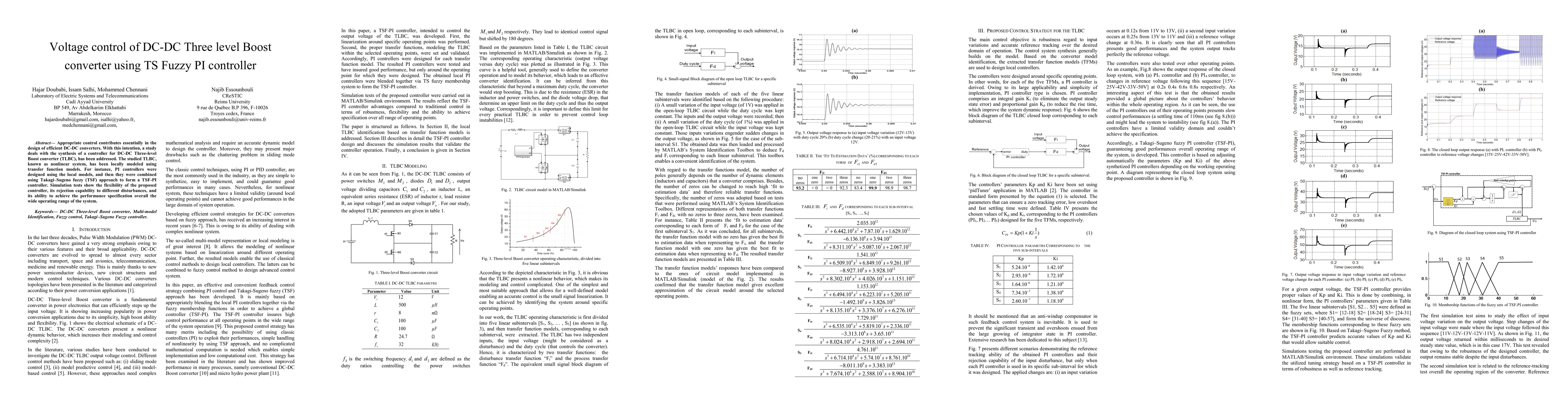 Appropriate control contributes essentially in the design of efficient DC-DC converters. With this intention, a study deals with the synthesis of a controller for DC-DC Three-level Boost converter (TLBC), has been addressed. The studied TLBC, known as nonlinear system, has been locally modeled using transfer function models. For instance, PI controllers were designed using the local models, and then they were combined using Takagi-Sugeno fuzzy (TSF) approach to form a TSF-PI controller. Simulation tests show the flexibility of the proposed controller, its rejection capability to different disturbances, and its ability to achieve the performance specification overall the wide operating range of the system.