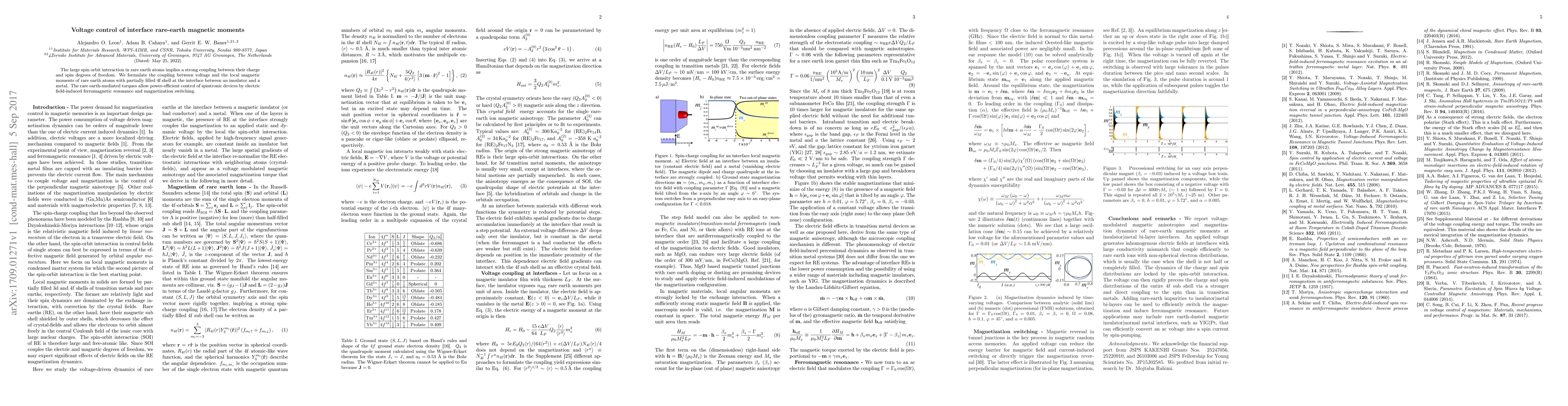 This paper explores the coupling between voltage and rare earth magnetic moments at insulator-metal interfaces, leveraging strong spin-orbit interactions for efficient control of spintronic devices through electric field-induced effects.