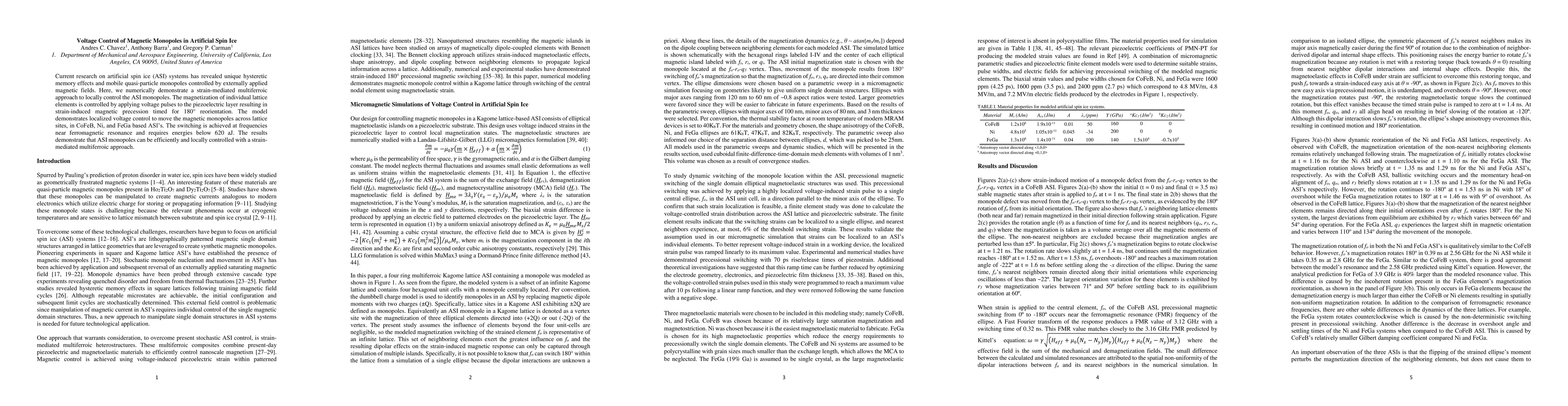 This paper demonstrates a strain-mediated multiferroic method to control magnetic monopoles in artificial spin ice using voltage pulses. The voltage-induced strain reorients the magnetization, enabling local control of monopoles in CoFeB, Ni, and FeGa based systems at low energy levels near ferromagnetic resonance.