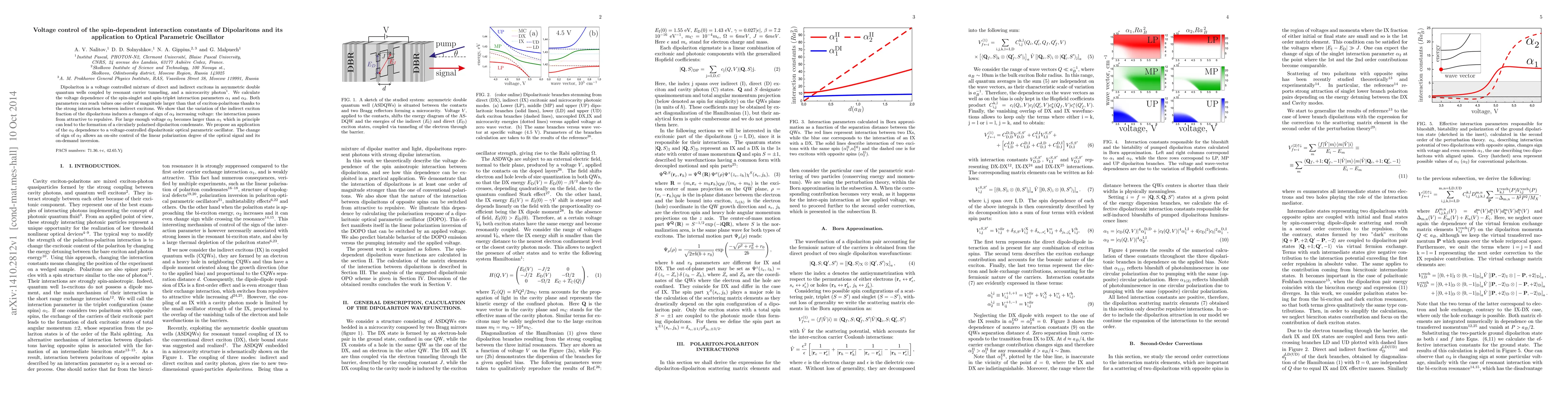 Dipolariton is a voltage controlled mixture of direct and indirect excitons in asymmetric double quantum wells coupled by resonant carrier tunneling, and a microcavity photon. We calculate the voltage dependence of the spin-singlet and spin-triplet interaction parameters $\alpha_{1}$ and $\alpha_{2}$. Both parameters can reach values one order of magnitude larger than that of exciton-polaritons thanks to the strong interaction between indirect excitons. We show that the variation of the indirect exciton fraction of the dipolaritons induces a changes of sign of $\alpha_{2}$ increasing voltage: the interaction passes from attractive to repulsive. For large enough voltage $\alpha_{2}$ becomes larger than $\alpha_{1}$ which in principle can lead to the formation of a circularly polarised dipolariton condensate. We propose an application of the $\alpha_{2}$ dependence to a voltage-controlled dipolaritonic optical parametric oscillator. The change of sign of $\alpha_{2}$ allows an on-site control of the linear polarization degree of the optical signal and its on-demand inversion.