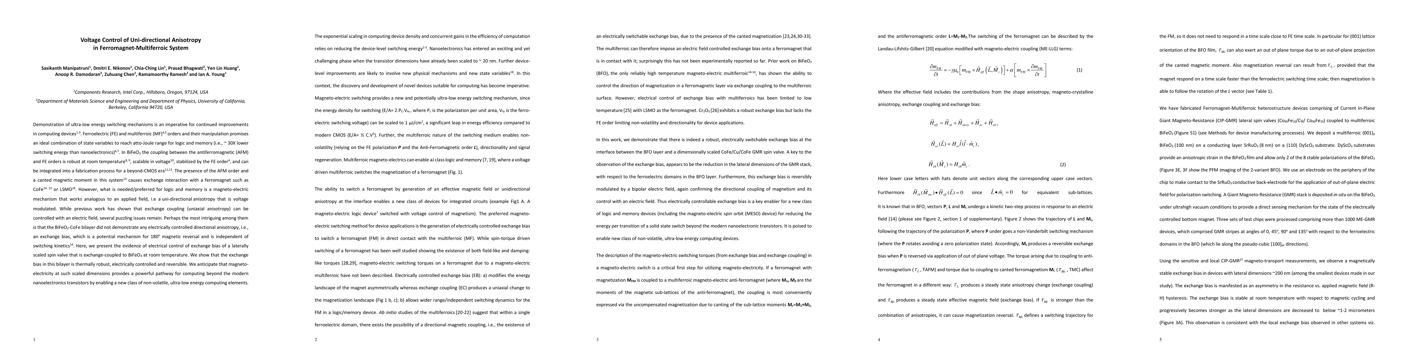 Researchers demonstrate voltage control of directional anisotropy in a ferromagnet-multiferroic system, enabling ultra-low energy computing elements with potential for logic and memory improvements.